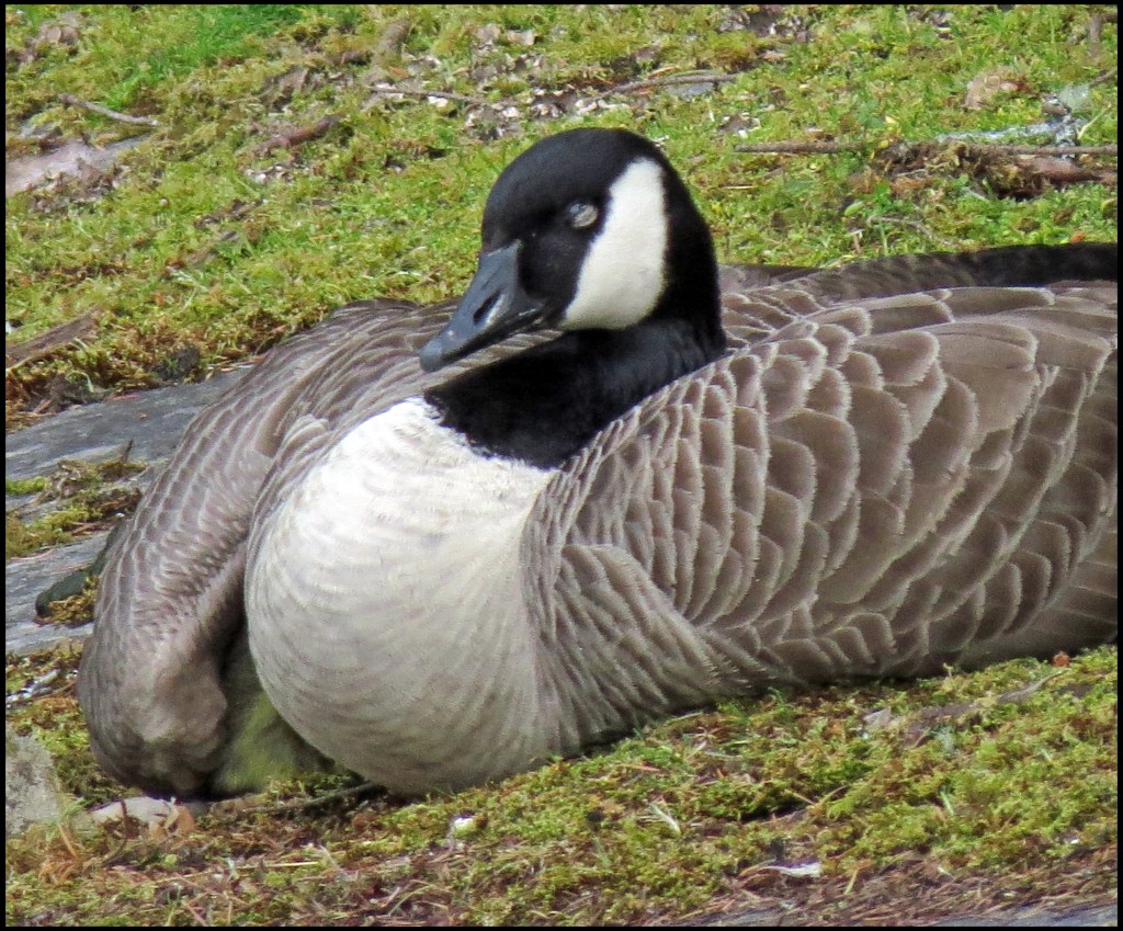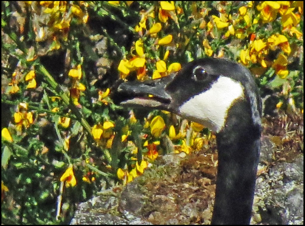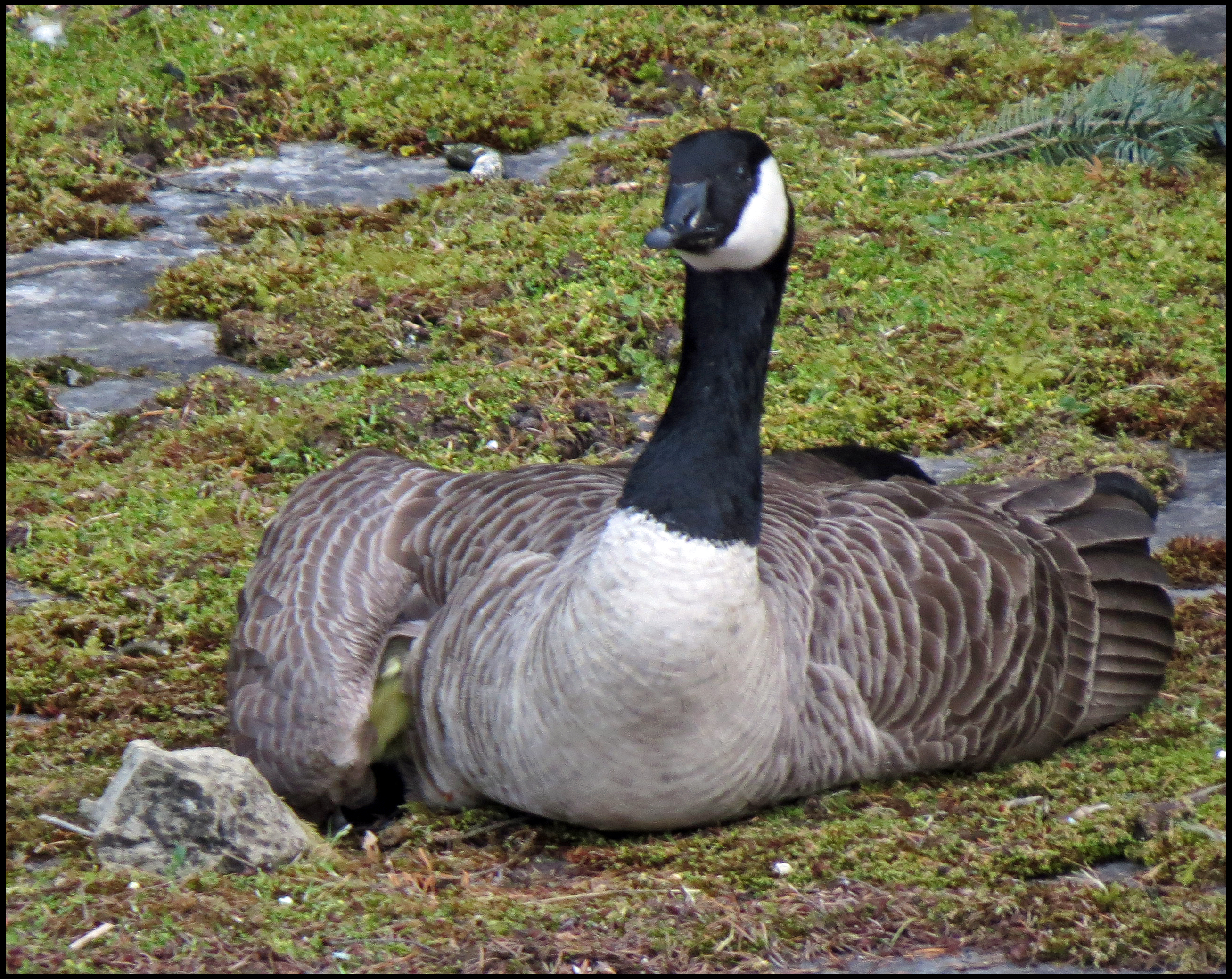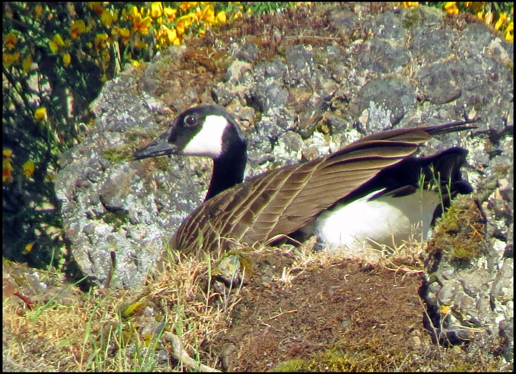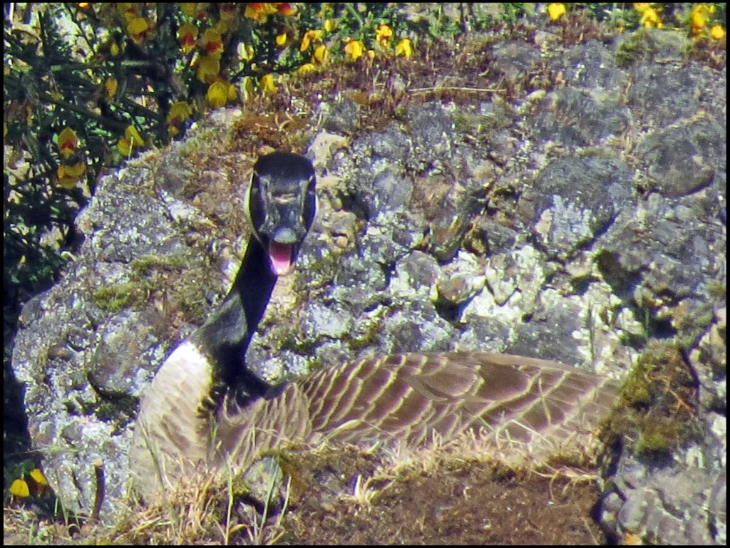 Well…..while looking for more patches of sedum, my eye caught a flash of white, just above the sedum. When I zoomed in on the white, I discovered a female Honker sitting just below the top of the bluff. I’d bet money that she was sitting on eggs, and I’d bet that lone Honker hanging around is the daddy.