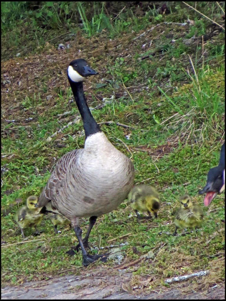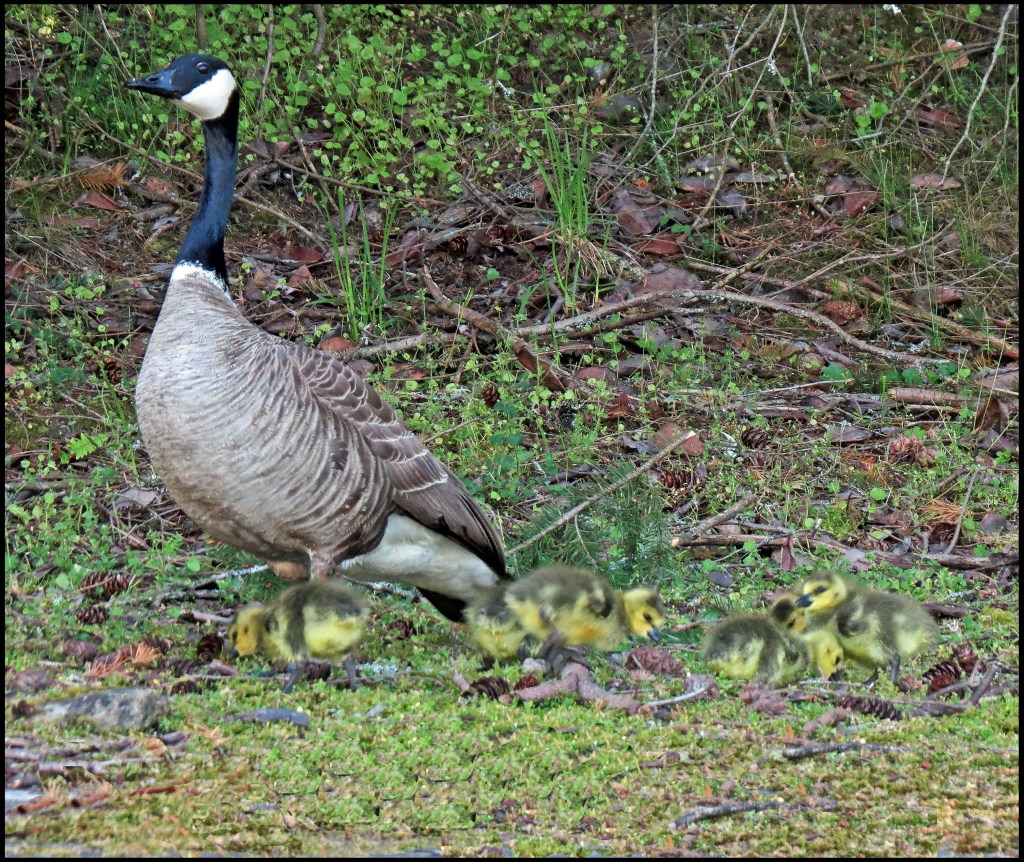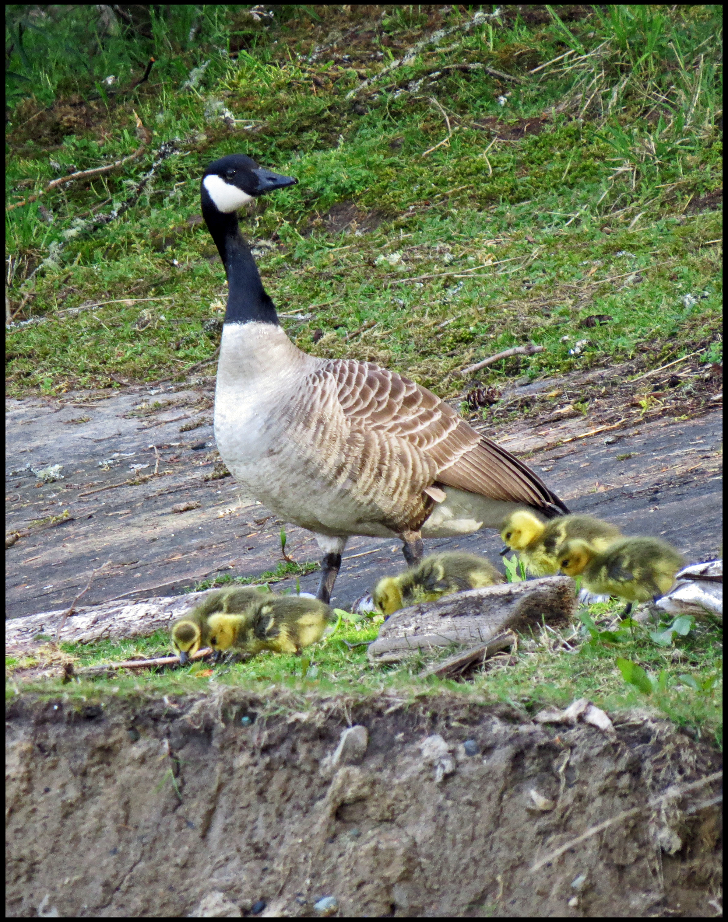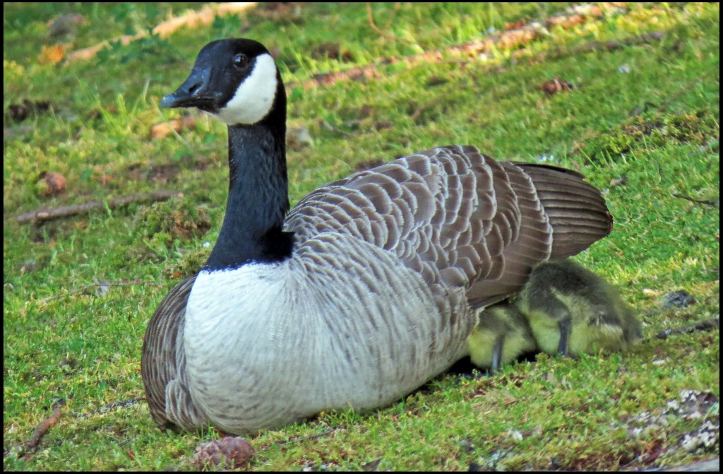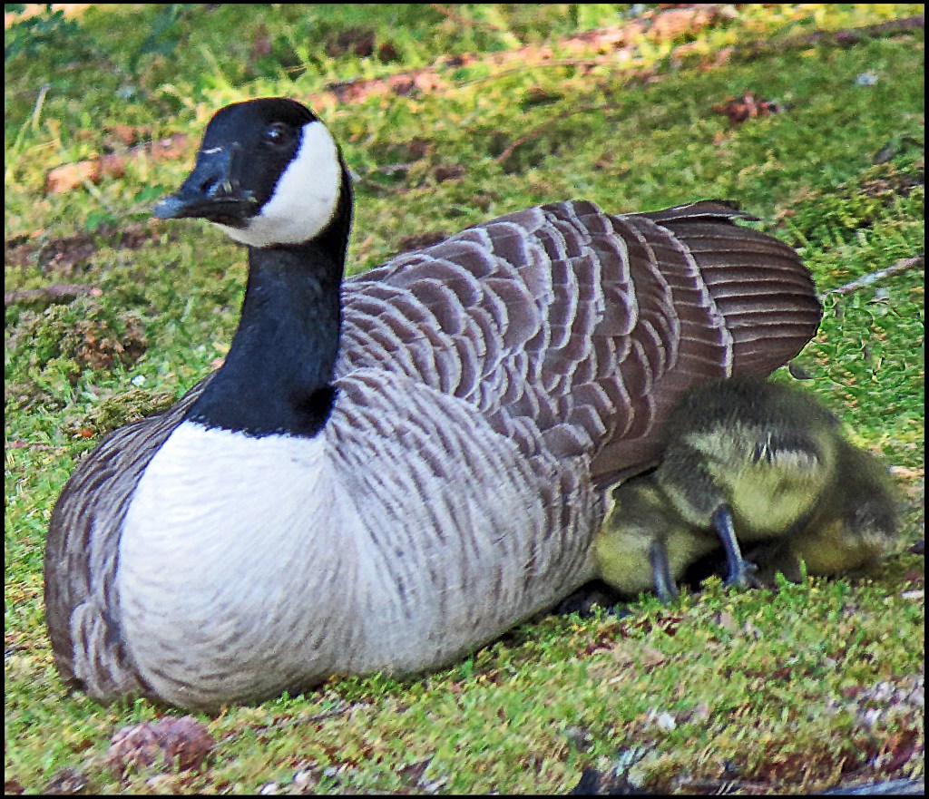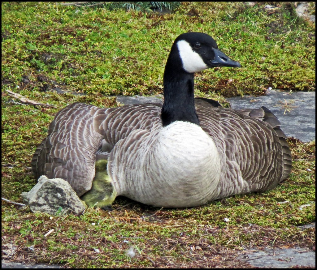 Well…..while looking for more patches of sedum, my eye caught a flash of white, just above the sedum. When I zoomed in on the white, I discovered a female Honker sitting just below the top of the bluff. I’d bet money that she was sitting on eggs, and I’d bet that lone Honker hanging around is the daddy.