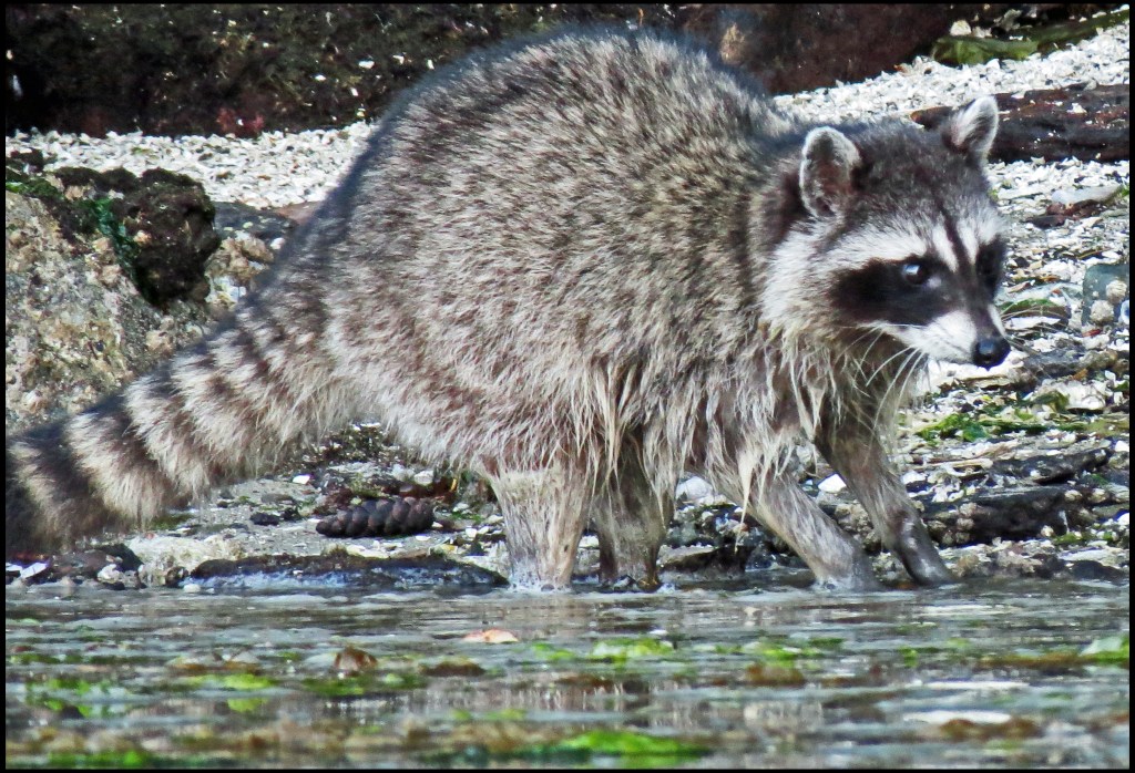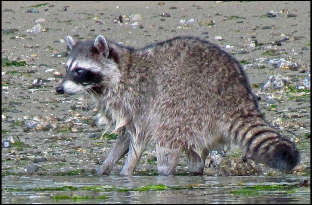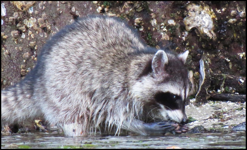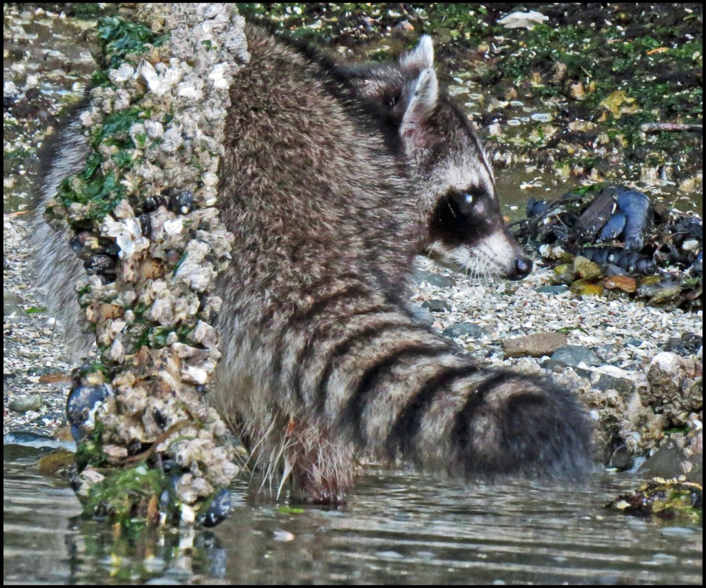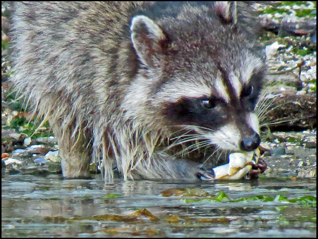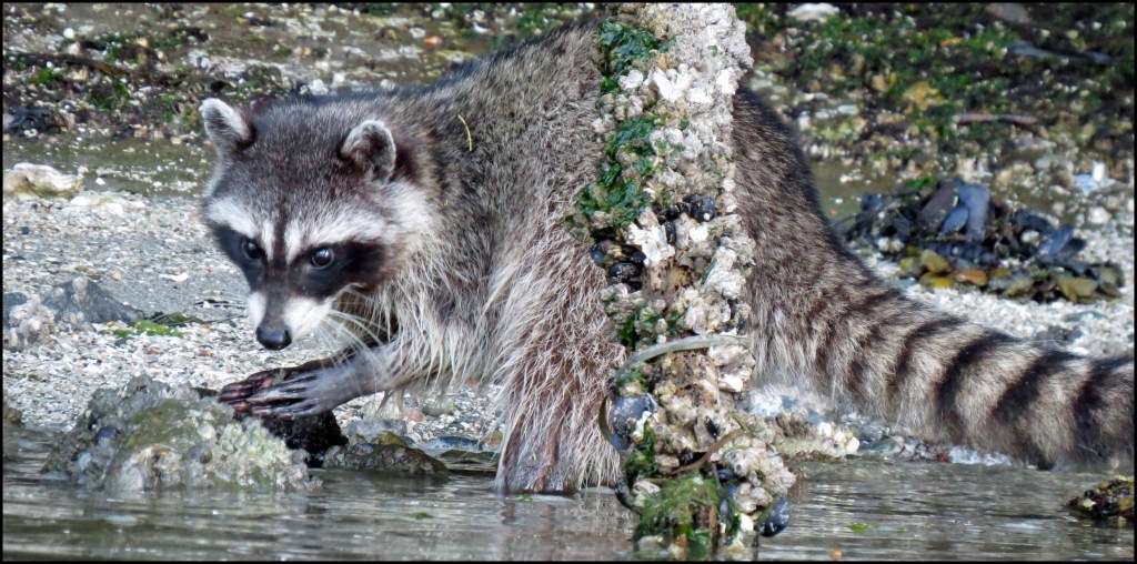 There was still light, and so inside, looking for photo ops. I didn’t have far to go before I spotted a raccoon working the shore. Low tide is a veritable shellfish buffet for the raccoon.