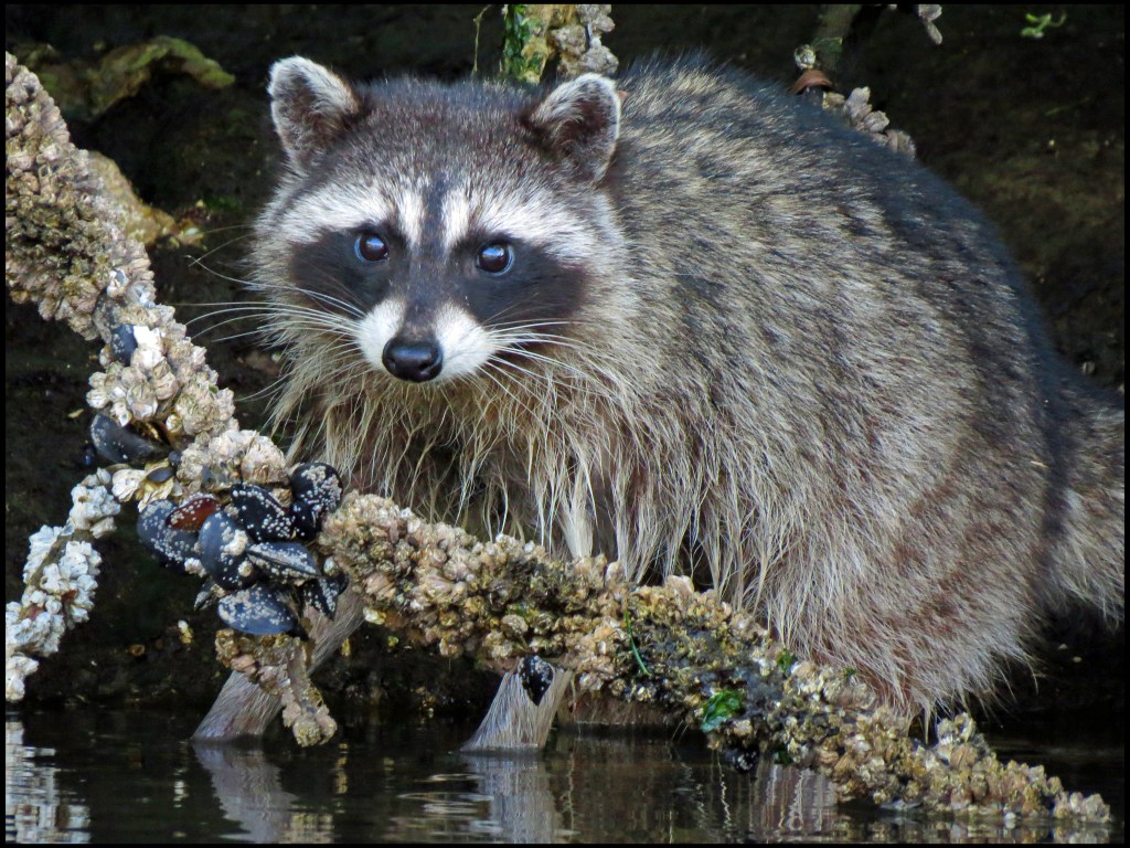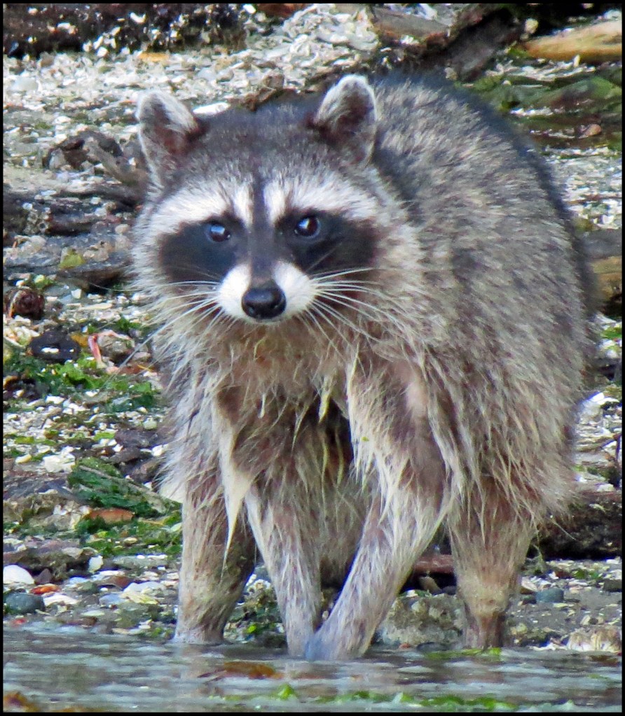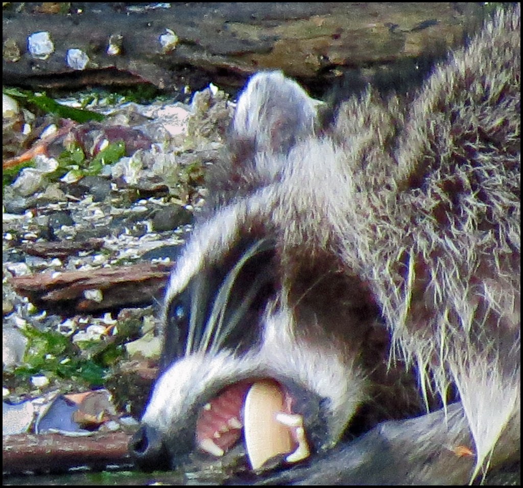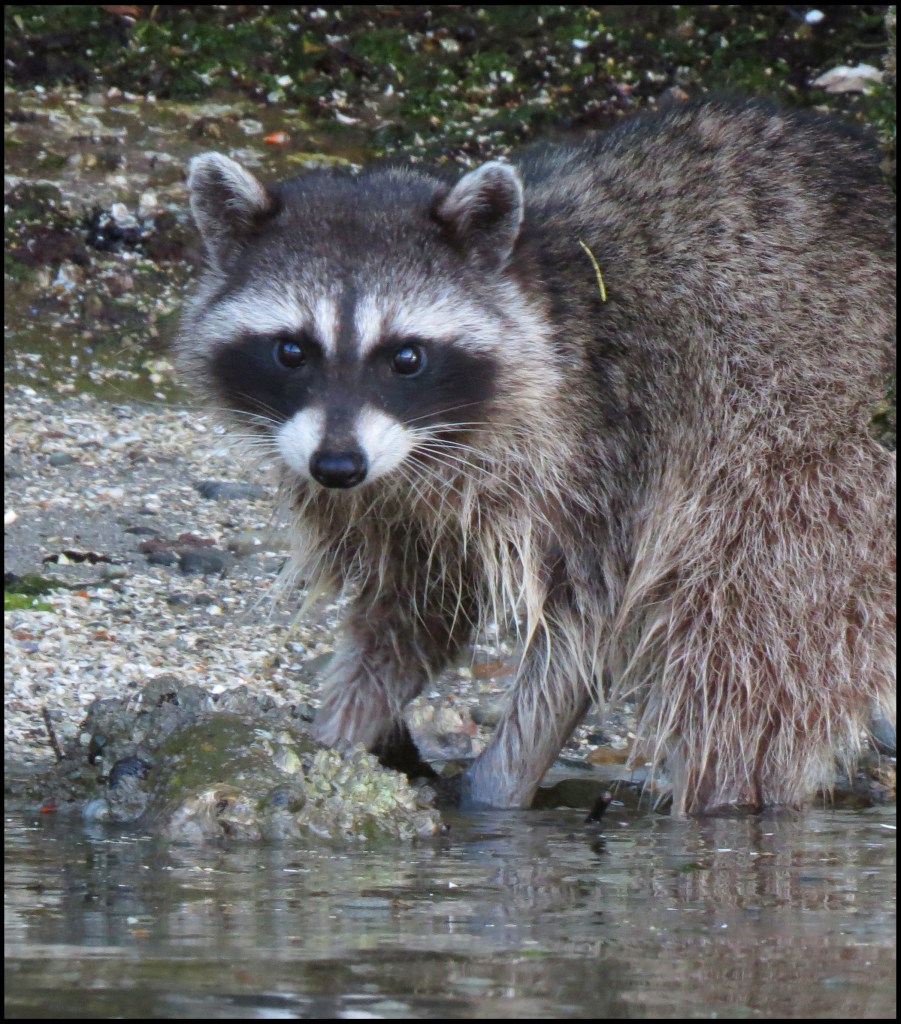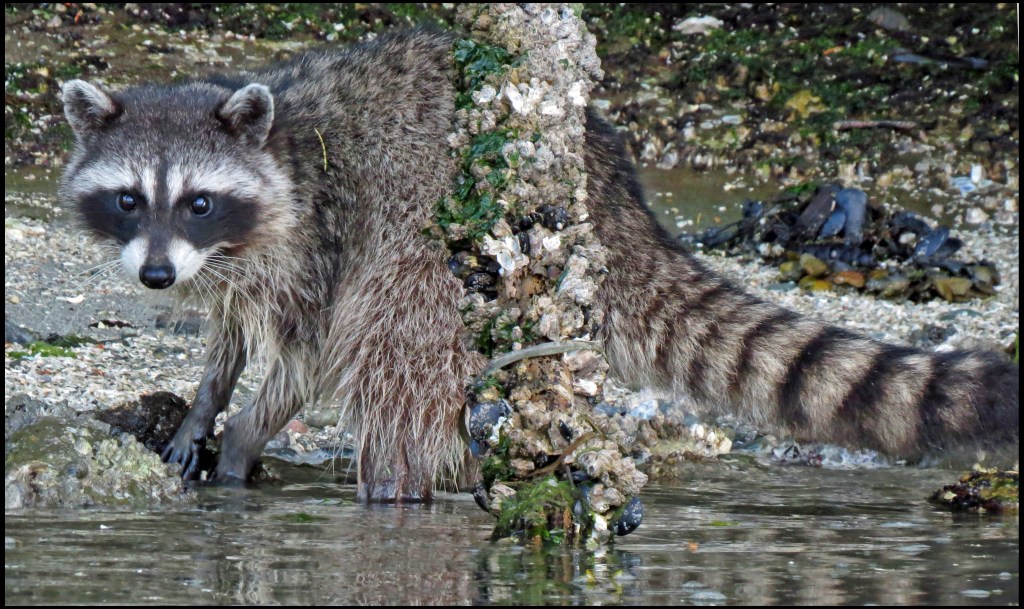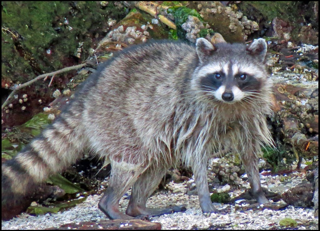There was still light, and so inside, looking for photo ops. I didn’t have far to go before I spotted a raccoon working the shore. Low tide is a veritable shellfish buffet for the raccoon.