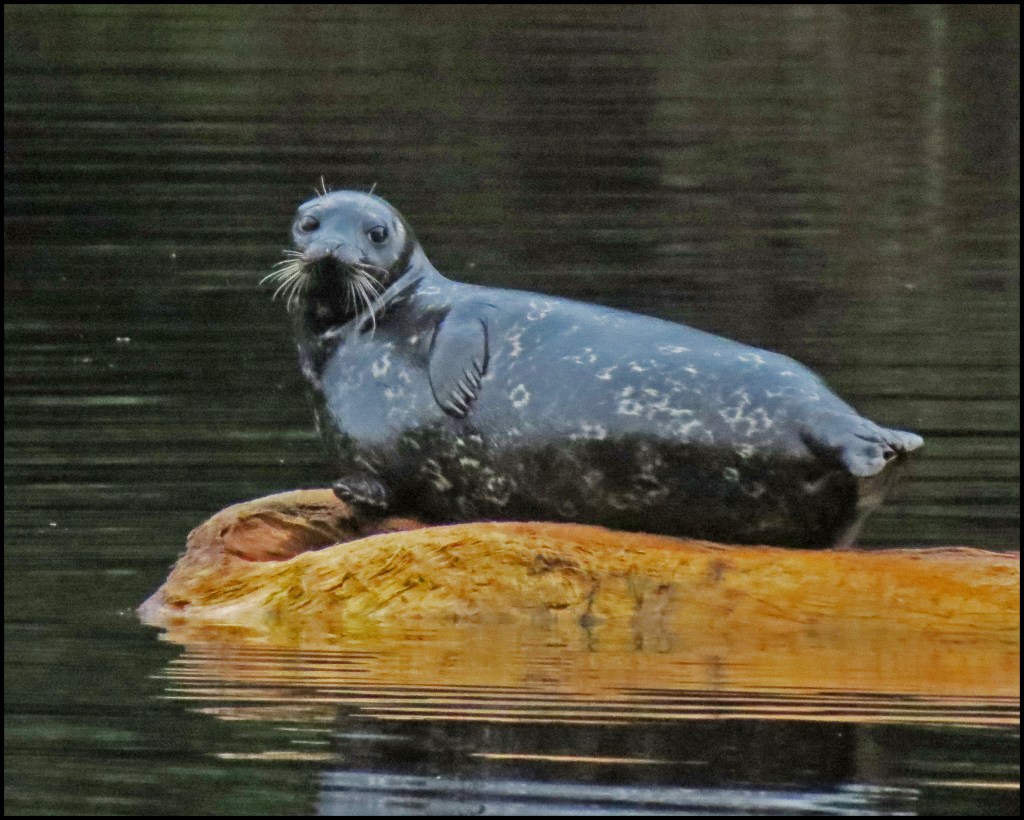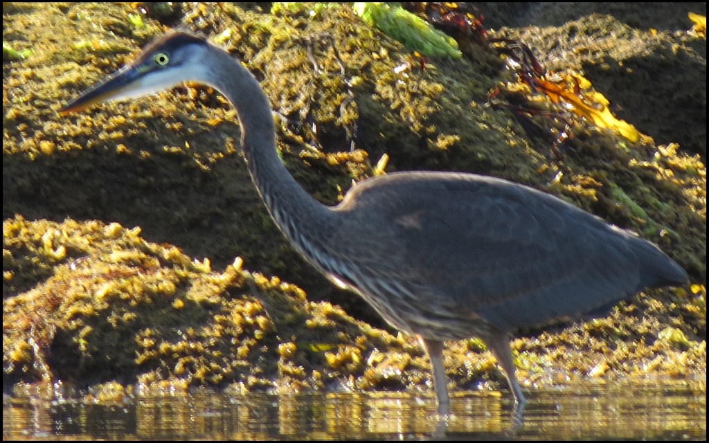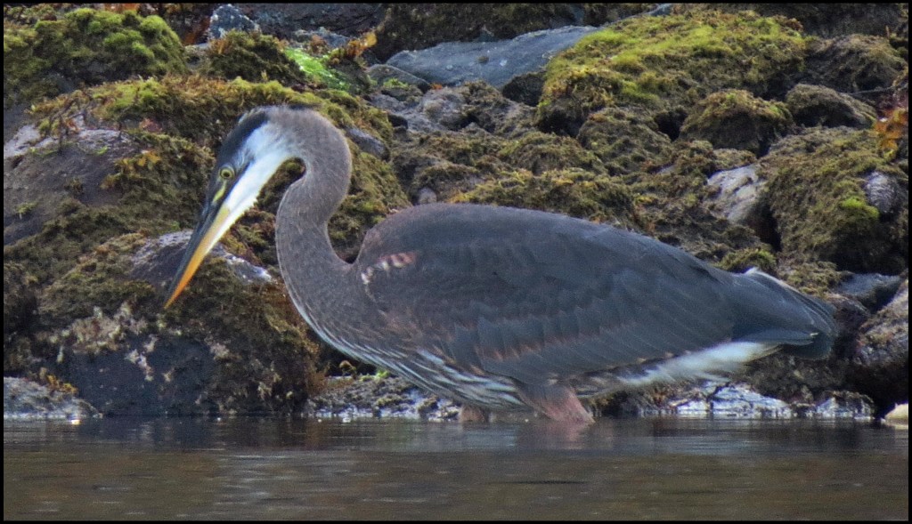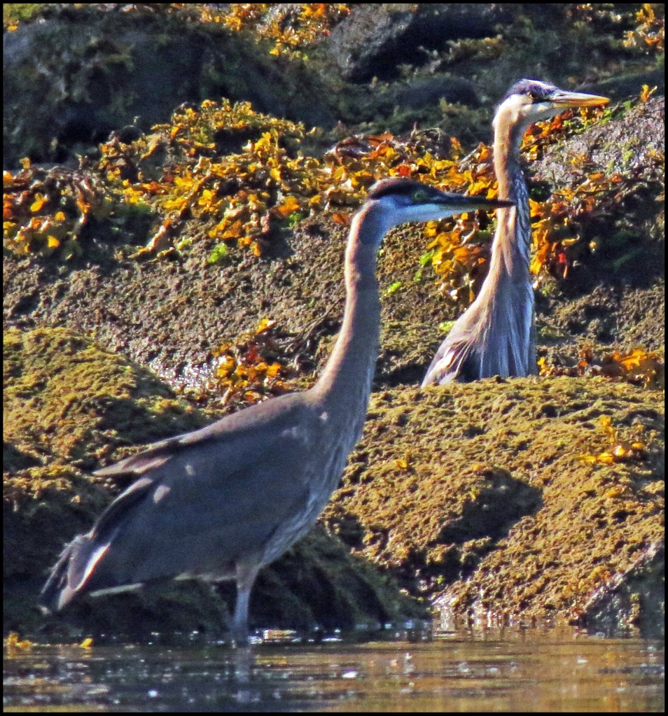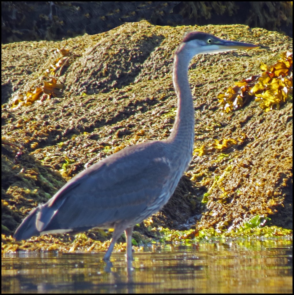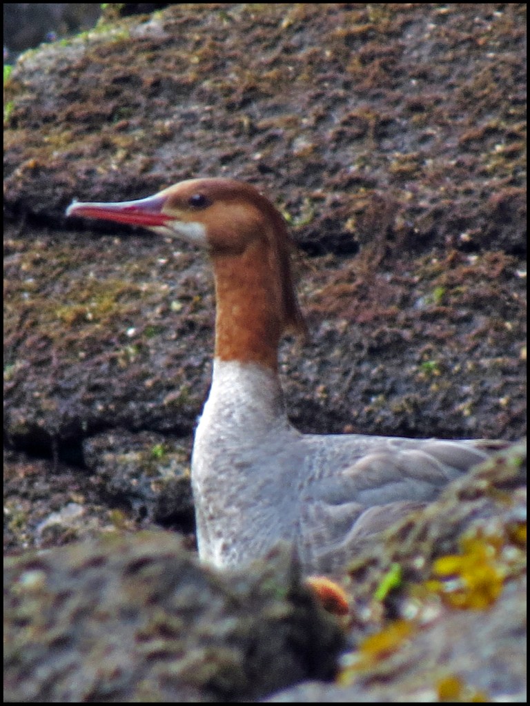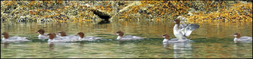 When I pushed against the rocks with my paddle, the kayak wouldn’t budge.  My first thought was that my skeg was stuck in a crevice.  The skeg, however, was not the problem.  While I had been patiently waiting for the mergansers to come out of hiding, the tide had gone down just enough to leave me high and dry.   I scooted forward and stepped out onto the rocks to get my weight off the kayak.  That’s when I discovered I’d been pivoting on a pinnacle rock.  Once off the rock, I was able to get back in and try to catch up with the mergansers.  By now, they were paddling like crazy, probably laughing like crazy, and getting farther and farther away.