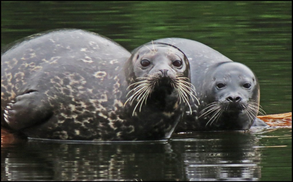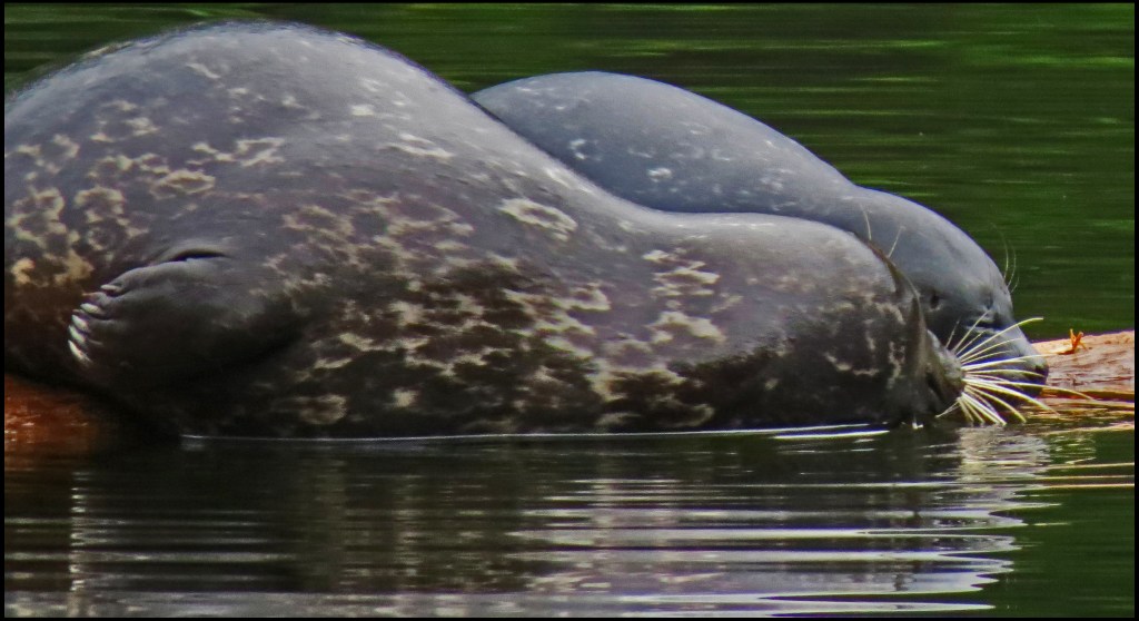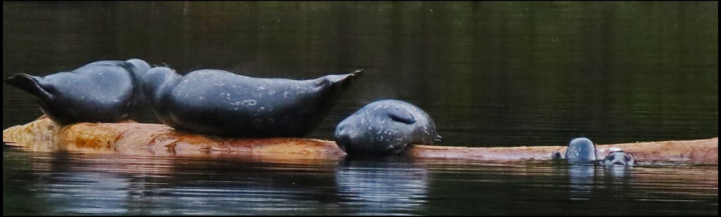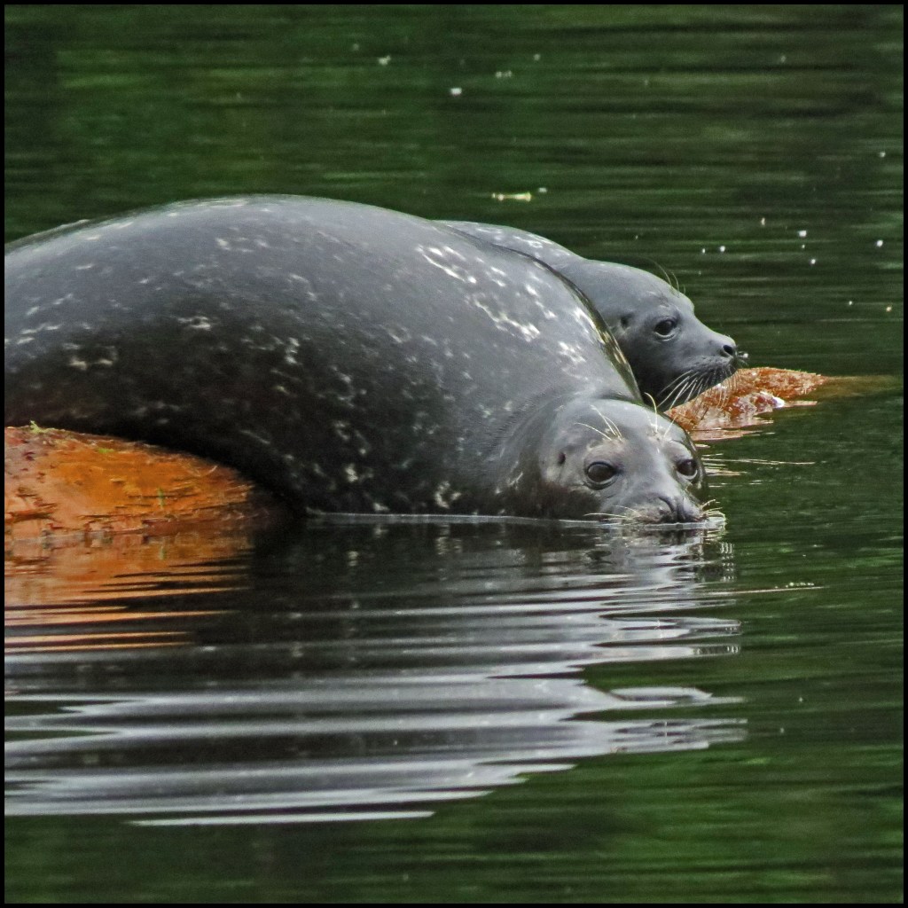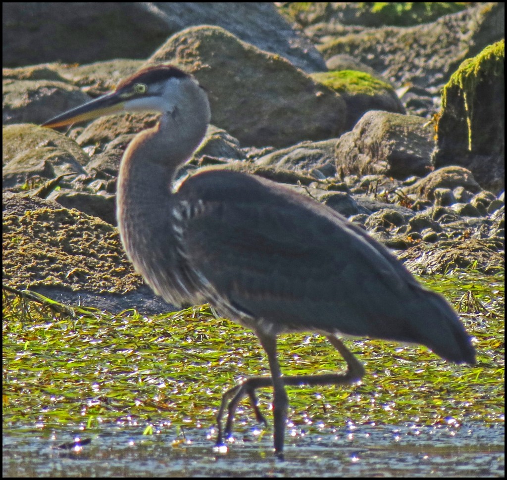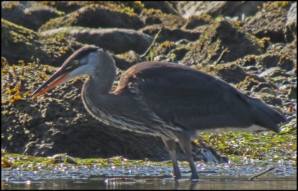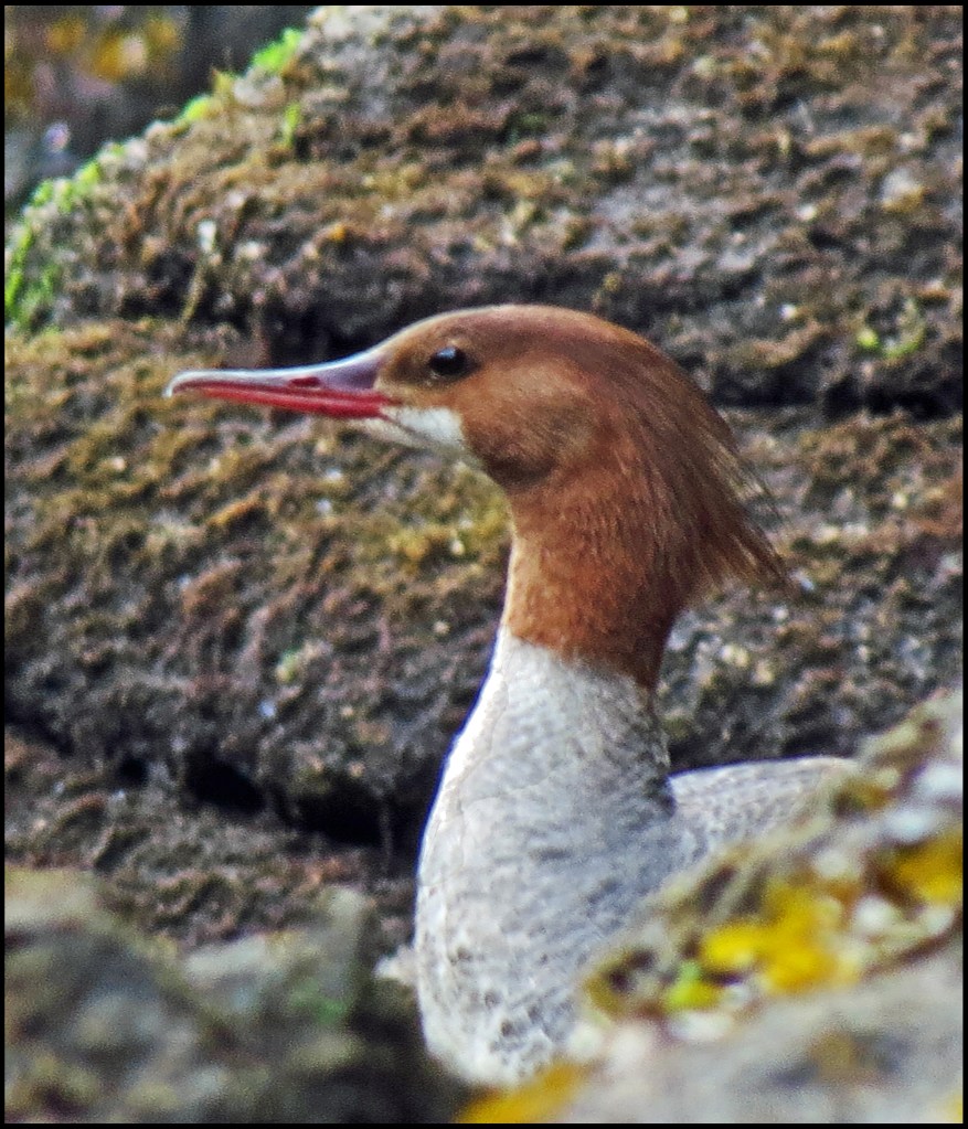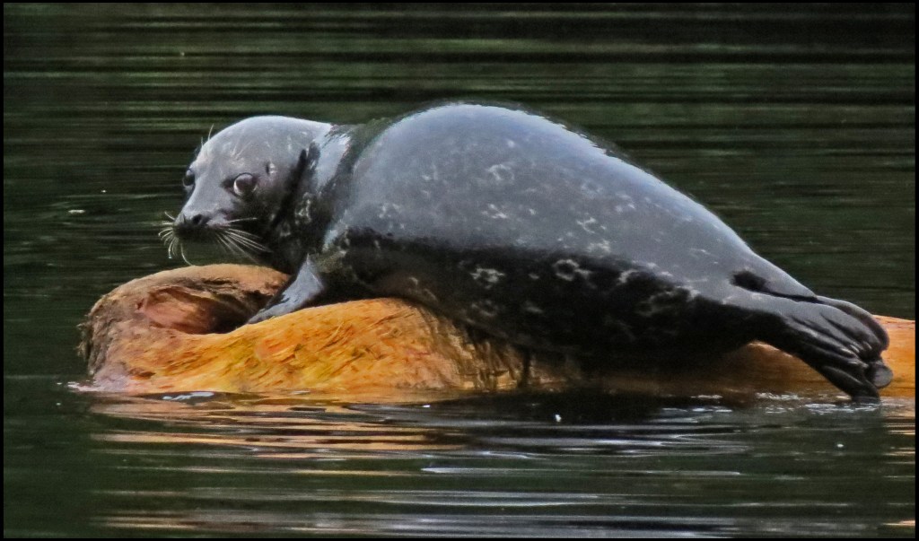 When I pushed against the rocks with my paddle, the kayak wouldn’t budge.  My first thought was that my skeg was stuck in a crevice.  The skeg, however, was not the problem.  While I had been patiently waiting for the mergansers to come out of hiding, the tide had gone down just enough to leave me high and dry.   I scooted forward and stepped out onto the rocks to get my weight off the kayak.  That’s when I discovered I’d been pivoting on a pinnacle rock.  Once off the rock, I was able to get back in and try to catch up with the mergansers.  By now, they were paddling like crazy, probably laughing like crazy, and getting farther and farther away.