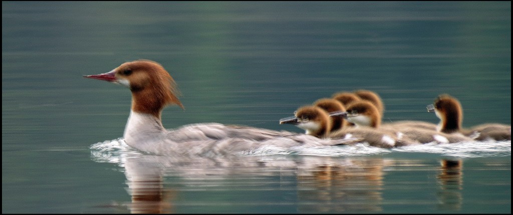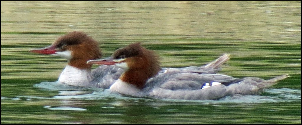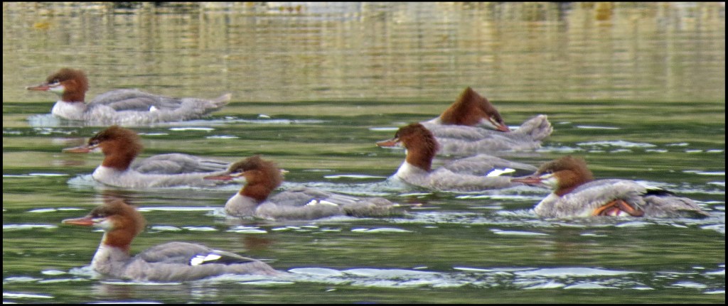As I’m brushing my teeth this morning, I notice something splashing water along the shoreline.  With the binoculars I discover that it’s the mergansers I’ve heard quacking every day, but never could find.  So, I drop everything and suit up as quickly as I can, hoping to finally get a shot of them.