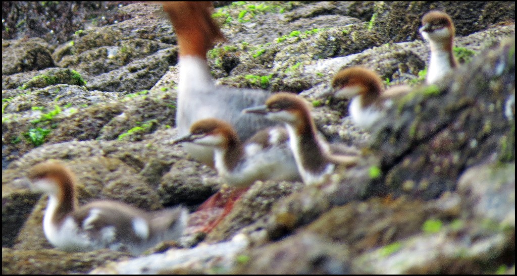 I crept along the rocky shore trying to get a better shot.  I found a spot where I could wedge myself among the rocks, so that the current wouldn’t keep turning me around, and waited for momma to make her move.  I took shot after shot, each one a duplicate of the previous shot, since she never moved a muscle, still staring me down.  Then, pandemonium broke out, as she herded her crew down to the water, and I struggled to get my kayak turned around.