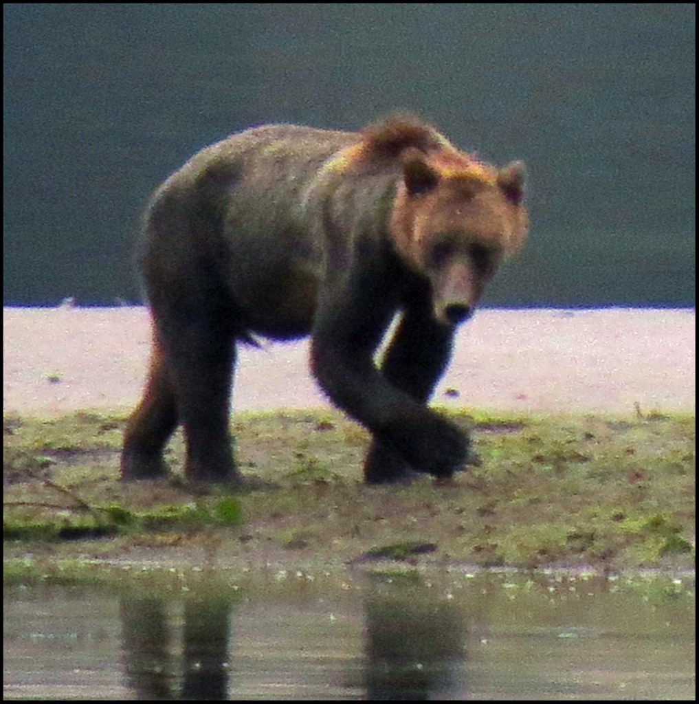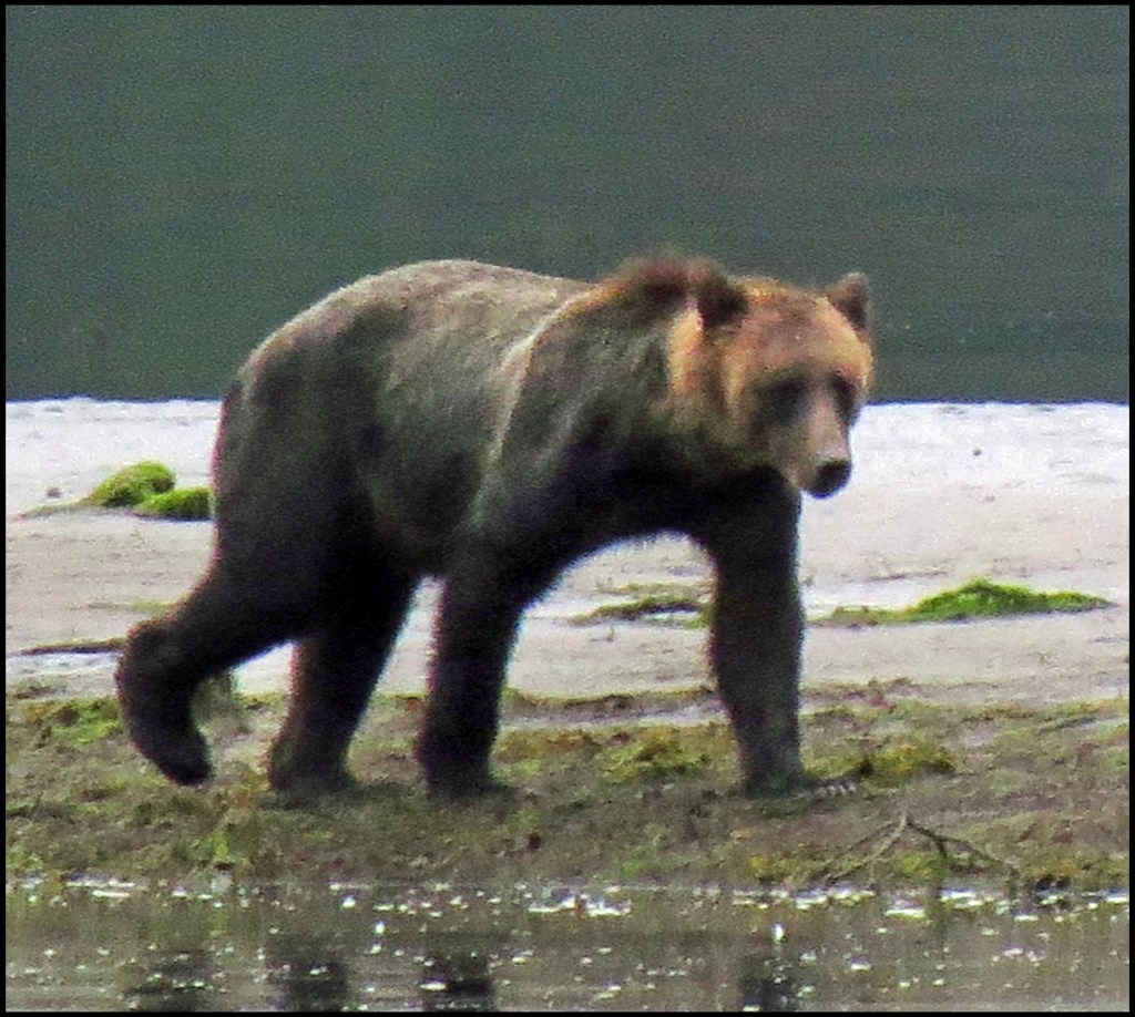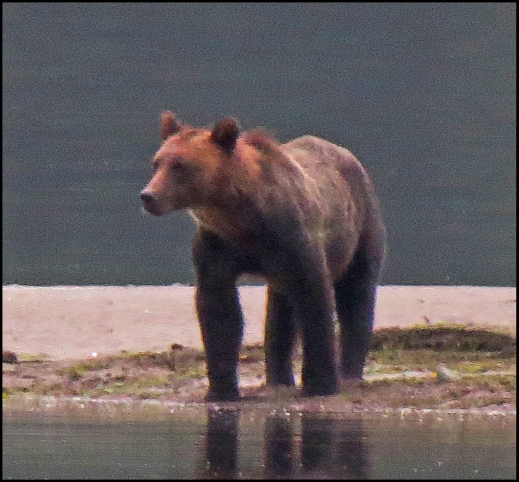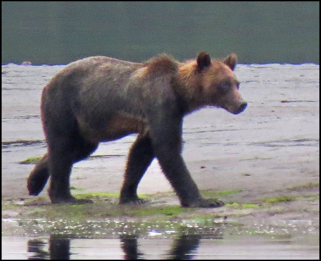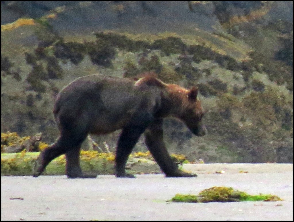 We have a spring tide today, so the low tide this morning is really low.  As I’m brushing my teeth, getting ready to leave for Bottleneck Inlet, I spotted a grizzly at the point of land where the seal rookery used to be.  Due to the lack of salmon this year, the seals have apparently moved their rookery elsewhere, not wanting to wind up being the grizzly’s alternate source of protein.