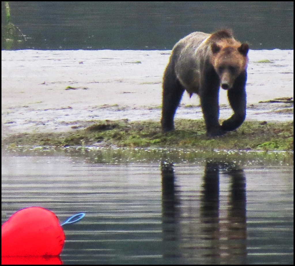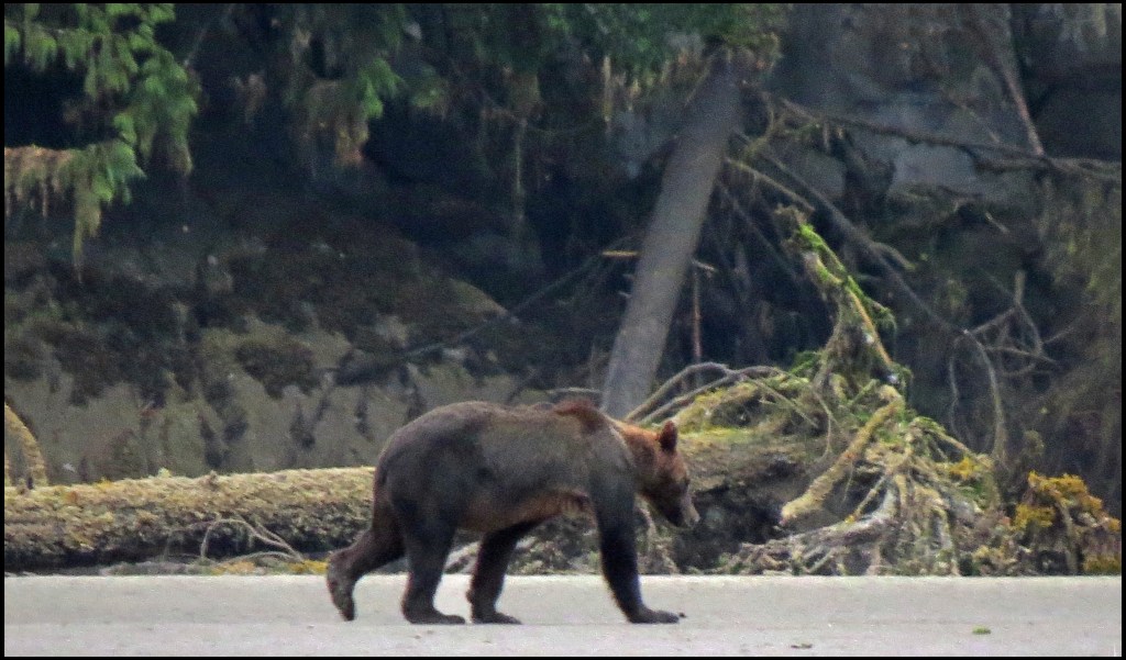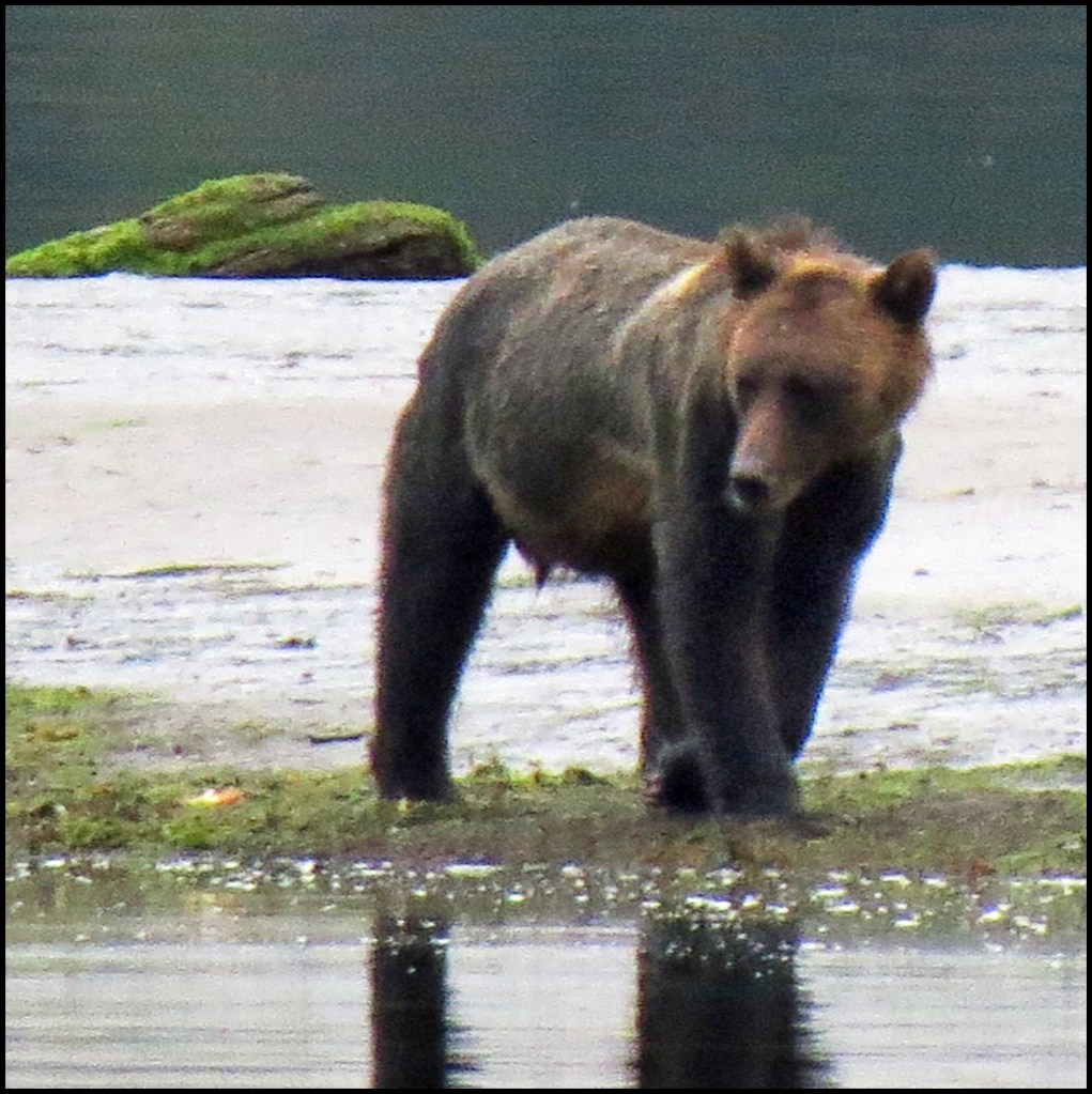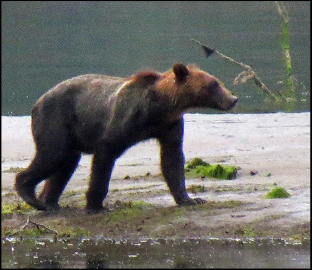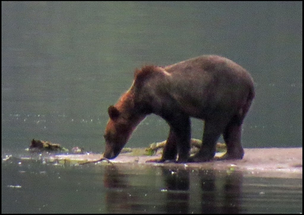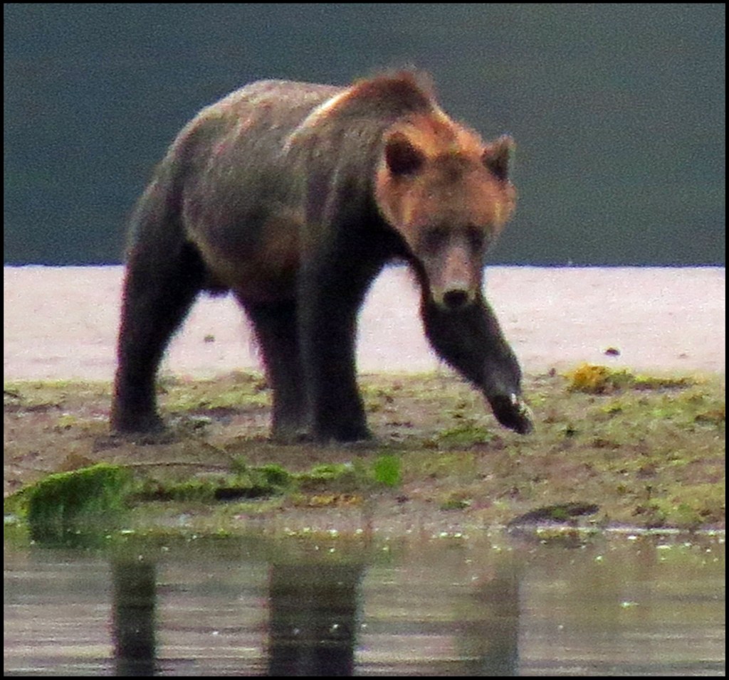 We have a spring tide today, so the low tide this morning is really low.  As I’m brushing my teeth, getting ready to leave for Bottleneck Inlet, I spotted a grizzly at the point of land where the seal rookery used to be.  Due to the lack of salmon this year, the seals have apparently moved their rookery elsewhere, not wanting to wind up being the grizzly’s alternate source of protein.