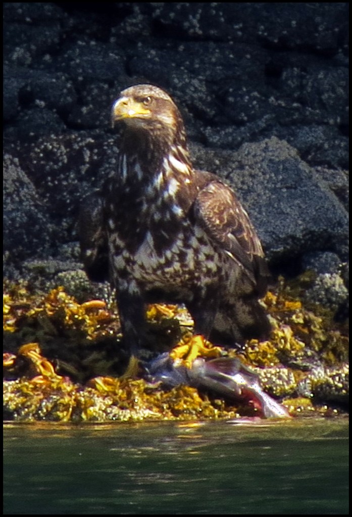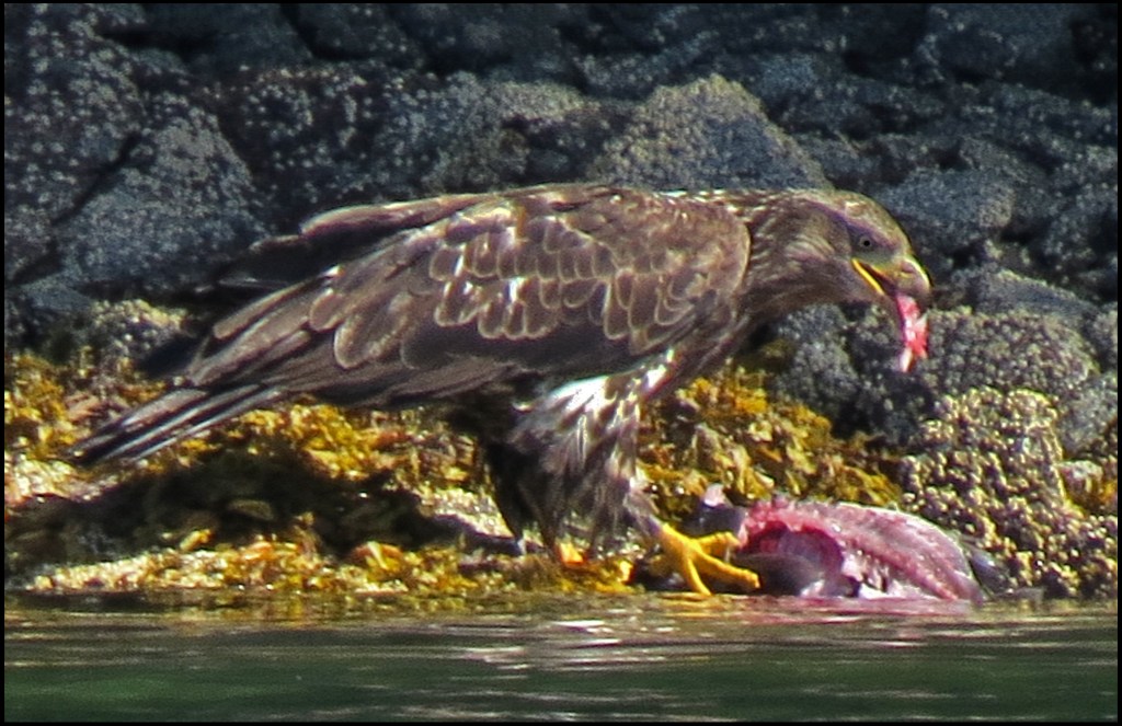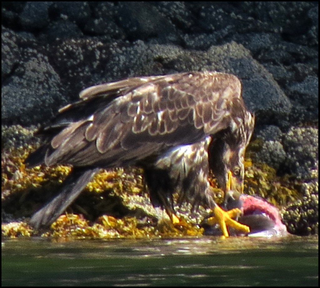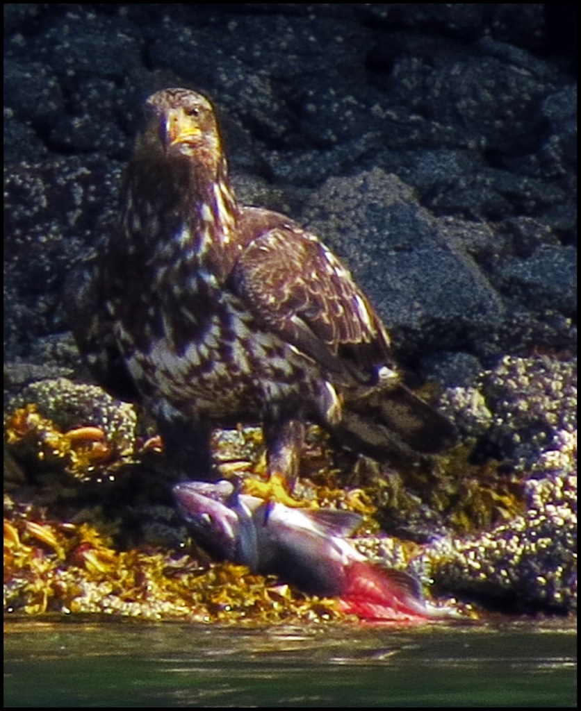 There was only one small powerboat anchored in Oliver Cove when we arrived, leaving us lots of anchoring choices.  The wind was blowing about 15 knots, so I didn’t go paddling.  Lucky for me, because this immature eagle caught a nice salmon and found a lovely dining spot near the boat.