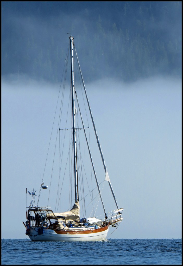 Finally, we have wall-to-wall blue skies in Rescue Bay.  Just outside the anchorage, in Mathieson Channel, however, there’s a dense layer fog right down on the water.   The fog doesn’t seem to concern the owner of this sailboat.  I hope he’s got a good radar.