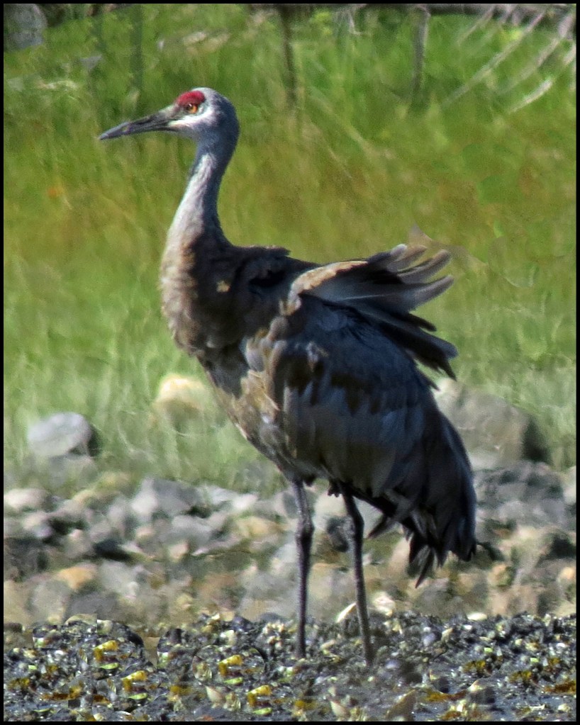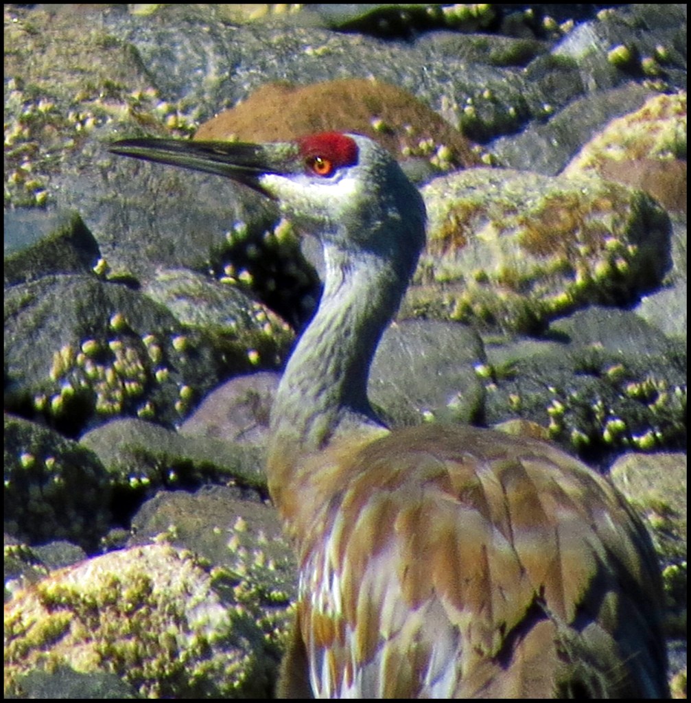 The tide is low, making the sandhill crane’s coloring the perfect camouflage for this muddy, rock-strewn beach.  I searched the shore for quite a while before spotting this sandhill browsing the rocks, looking for low tide goodies.  Could this be the same lone sandhill crane that I found here last month?  Unfortunately, the sandhill was too far away for a decent shot, and the sun was behind him.  Not good.  So, I finally decided to risk going ashore, hoping some wolf or bear wouldn’t decide this was a good place to hunt for sandhills also.  I pulled my kayak quite a ways up the beach, just in case the tide came up while I was gone.