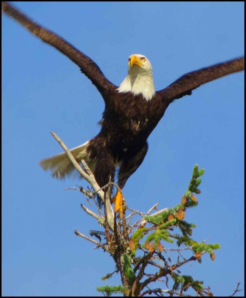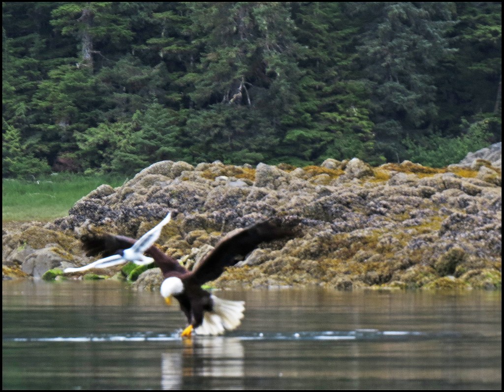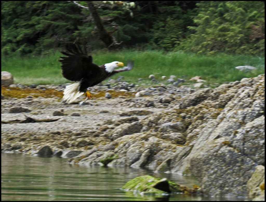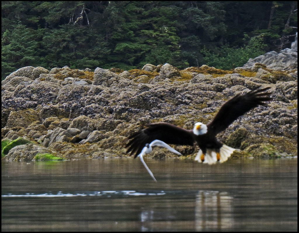 I paddled over to Barnard Harbour anchorage, hoping to get some shots of the waterfall, which should be pretty spectacular after the heavy rains.  Unfortunately, it required shooting right into the sun, which doesn’t work.  However, I did get a shot of this eagle.