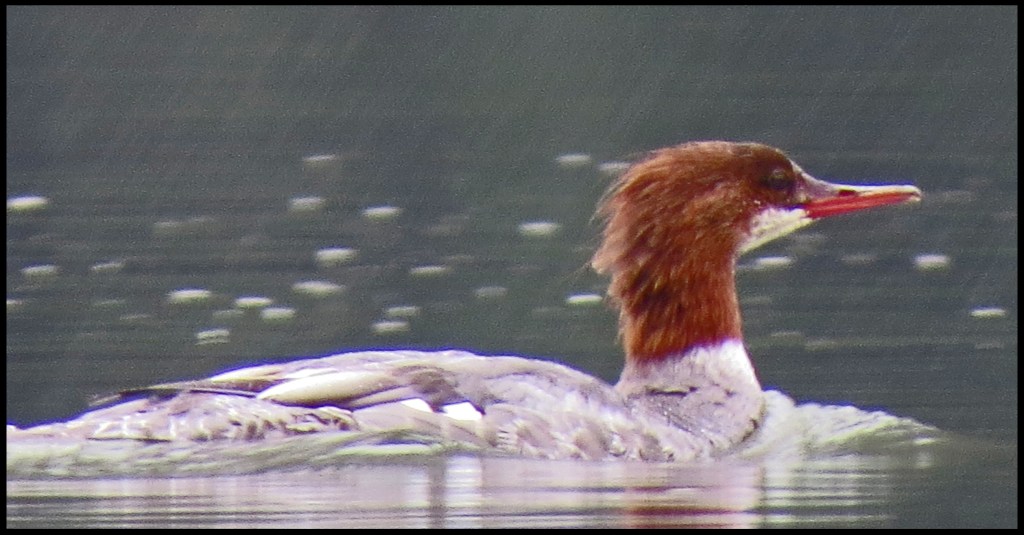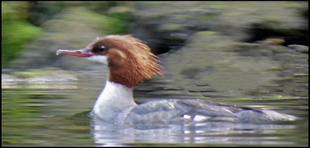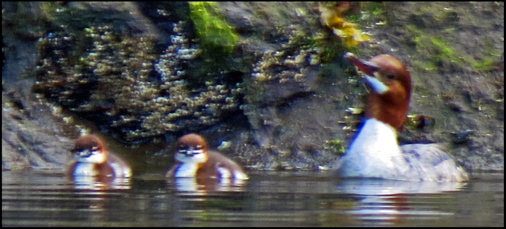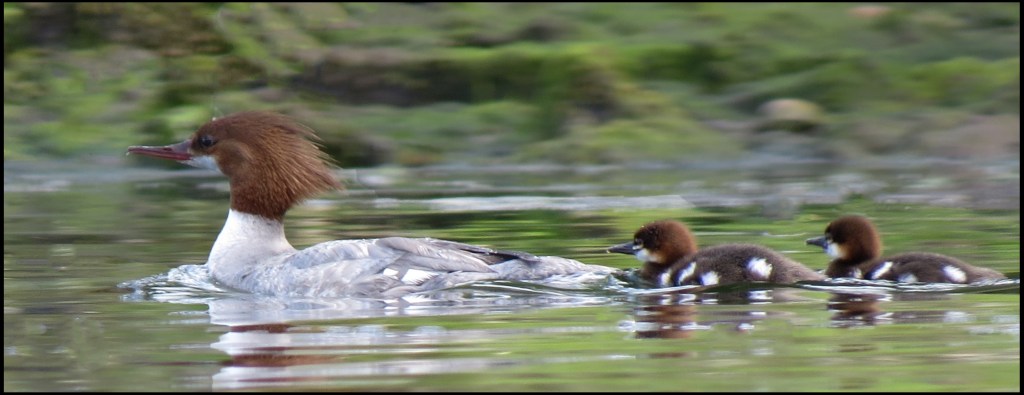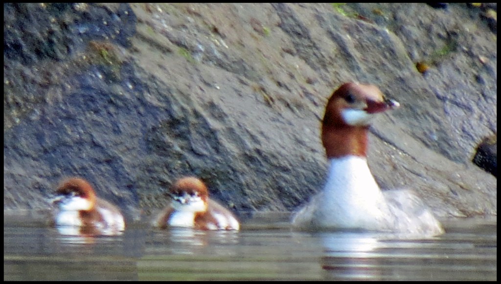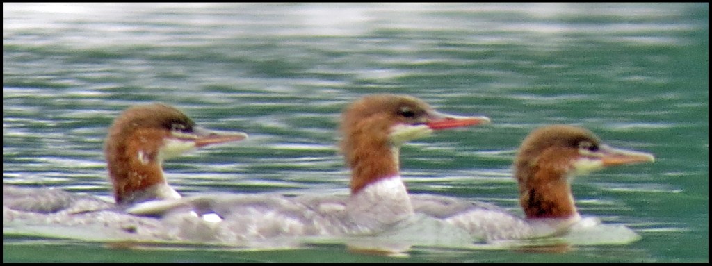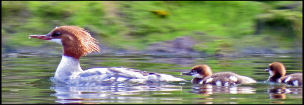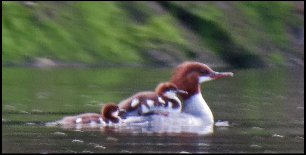 A family of mergansers was making its way downriver along the shore.