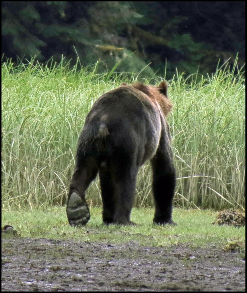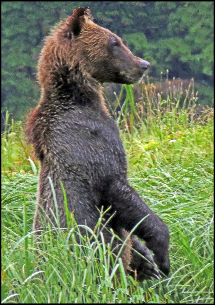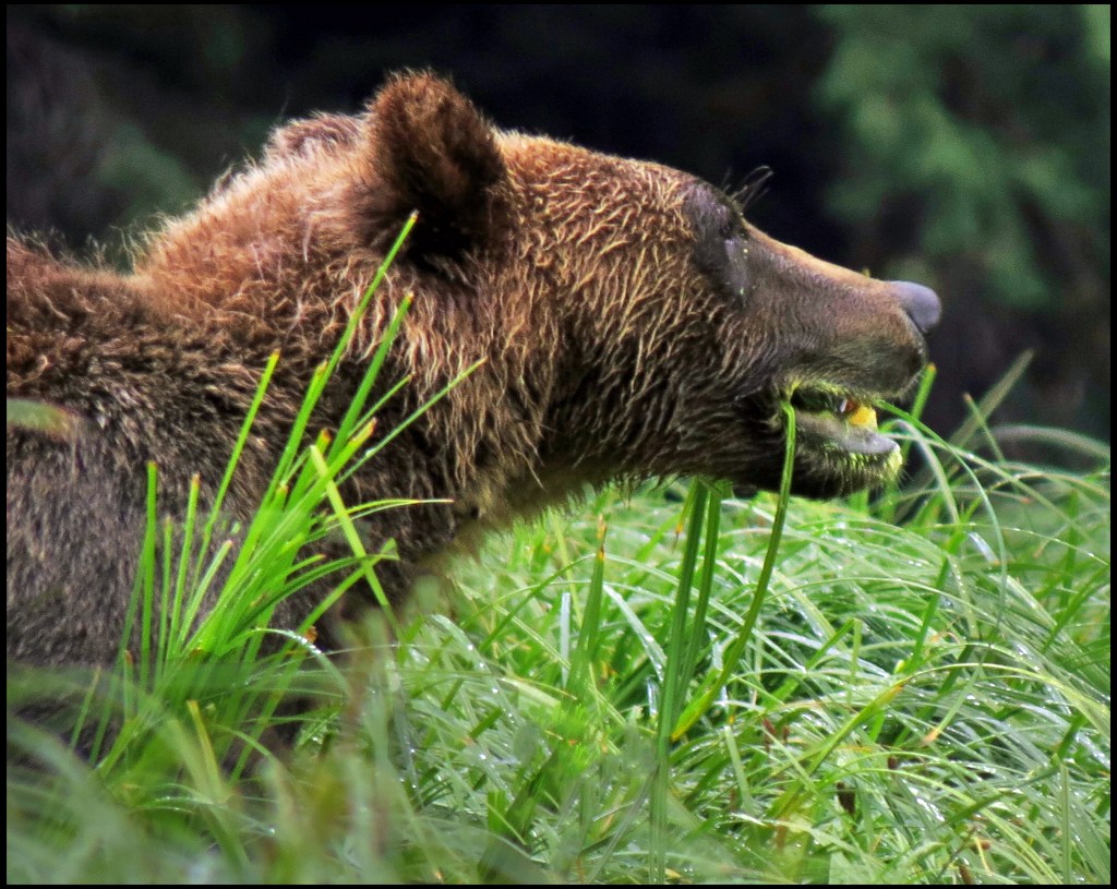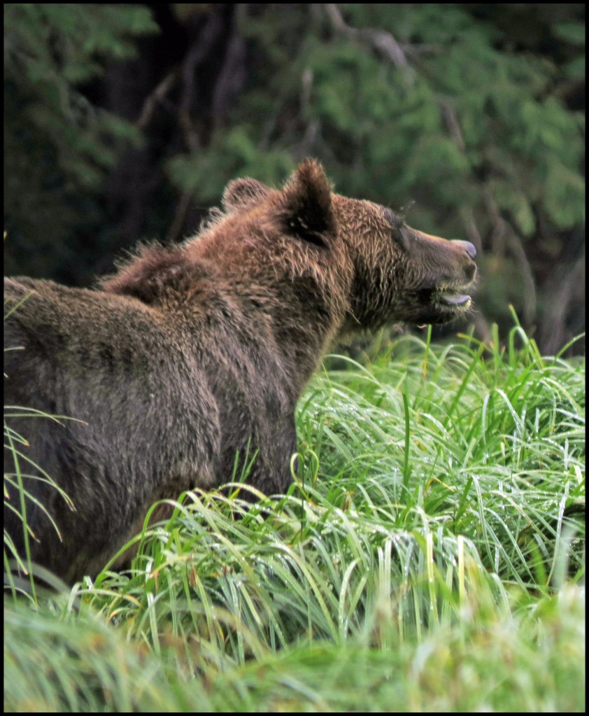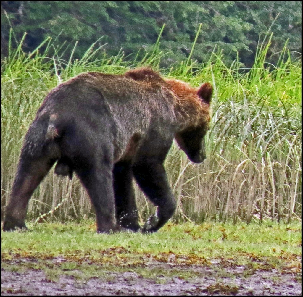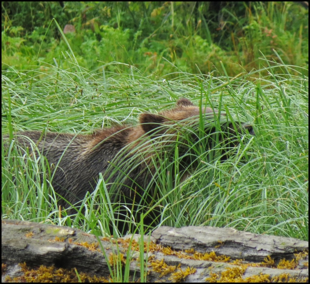 As I was getting suited up, a Hartley Bay grizzly bear tour boat arrived.  They picked up three kayaks they keep stashed onshore and headed out in search of grizzlies.  They didn’t go far, just to the beginning of the sedge field near the anchorage.  When I looked through the binoculars, I saw why.  A grizzly was enjoying his breakfast of sedge.  It’s amazing how much sedge a bear can eat, especially when there aren’t any salmon around, and the salmon just didn’t show up this year.  So, it’s sedge for breakfast, lunch and dinner, unless they can catch a slow seal or kayaker.