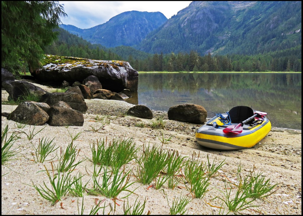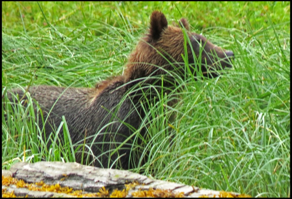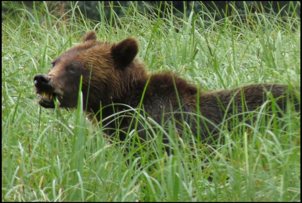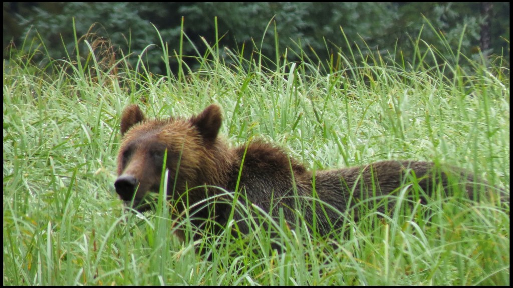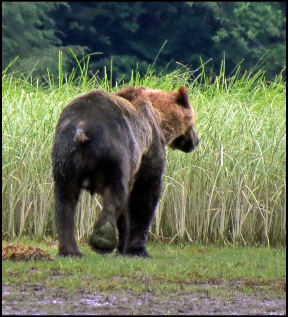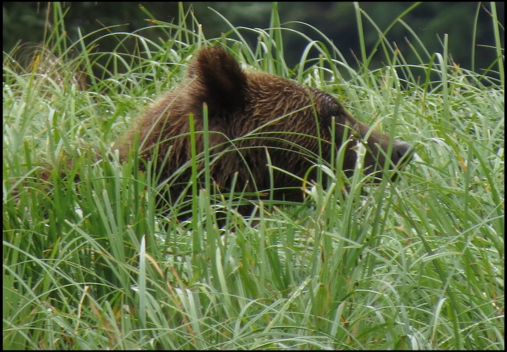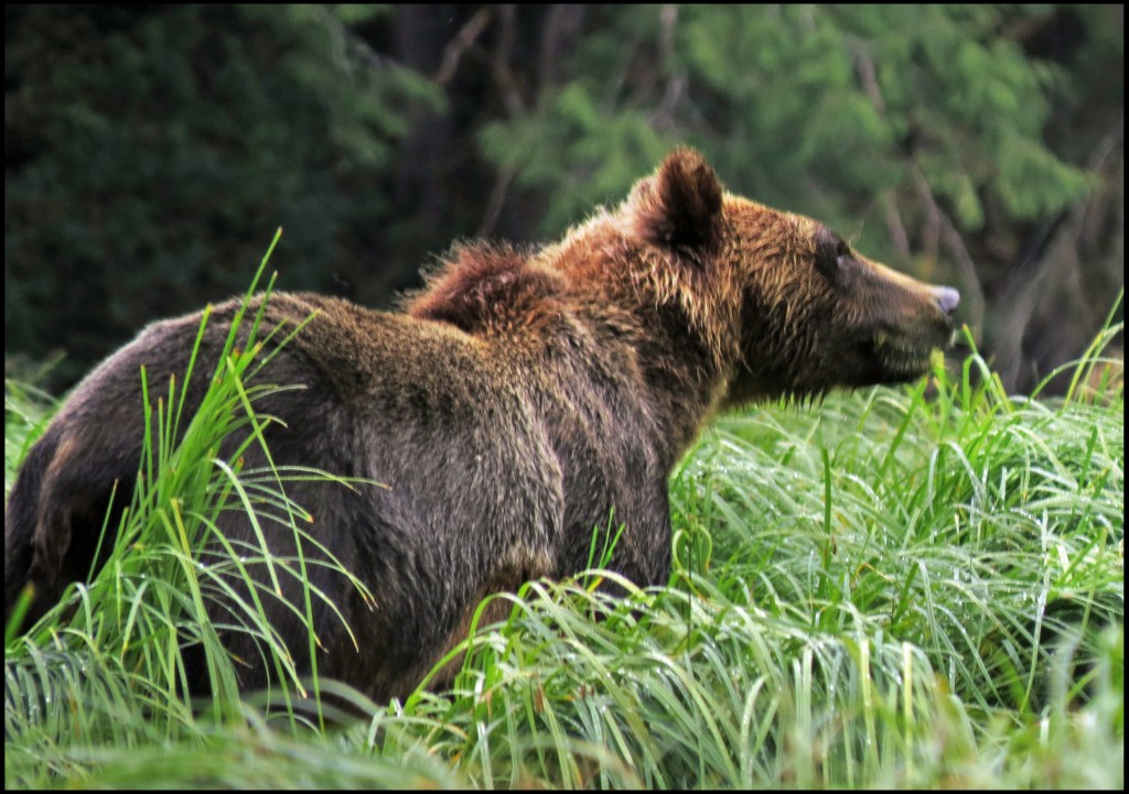 As I was getting suited up, a Hartley Bay grizzly bear tour boat arrived.  They picked up three kayaks they keep stashed onshore and headed out in search of grizzlies.  They didn’t go far, just to the beginning of the sedge field near the anchorage.  When I looked through the binoculars, I saw why.  A grizzly was enjoying his breakfast of sedge.  It’s amazing how much sedge a bear can eat, especially when there aren’t any salmon around, and the salmon just didn’t show up this year.  So, it’s sedge for breakfast, lunch and dinner, unless they can catch a slow seal or kayaker.