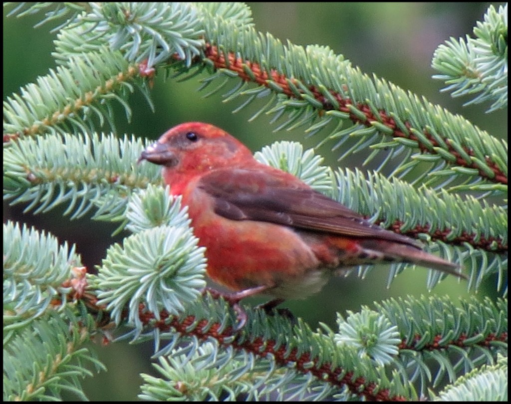 Near the sweat lodge, I saw a flash of red land in a small pine tree.  I’m not certain, but this looks like a Hepatic Tanager, although they are not supposed to be this far north.