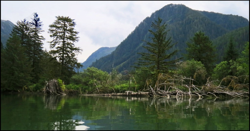 It was high tide, so I headed up the creek at the head of the inlet.  I didn’t get very far before the creek narrowed considerably, and I ran out of water.  This is a favorite spot for grizzlies, so I didn’t feel comfortable paddling in shallow water.  I decided the sensible thing to do would be to get out and walk my kayak back to deeper water.