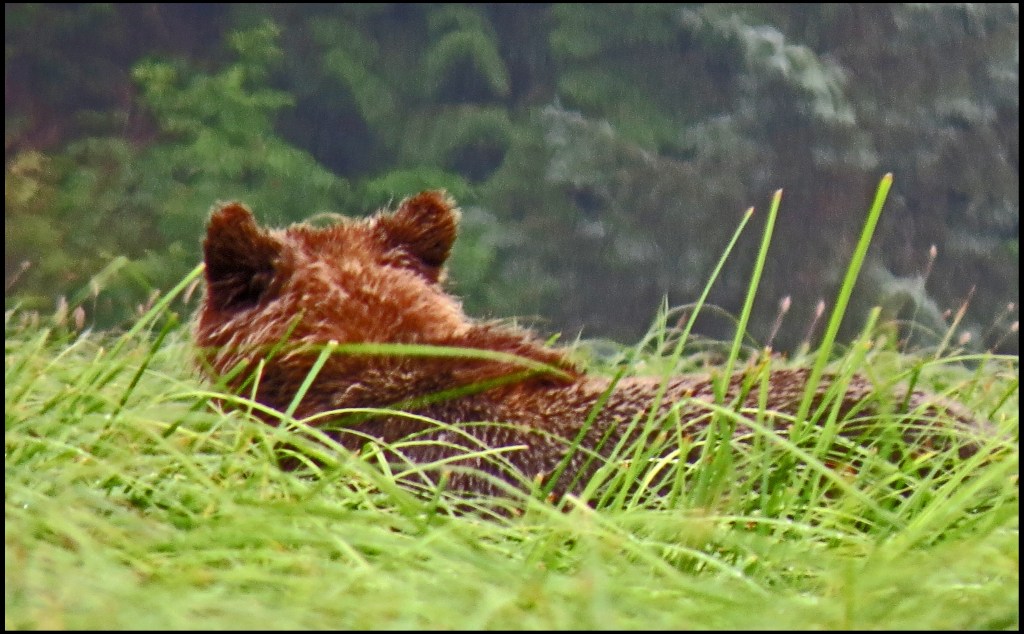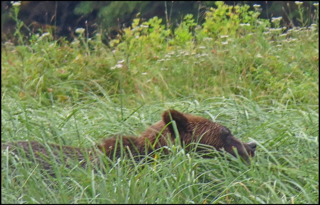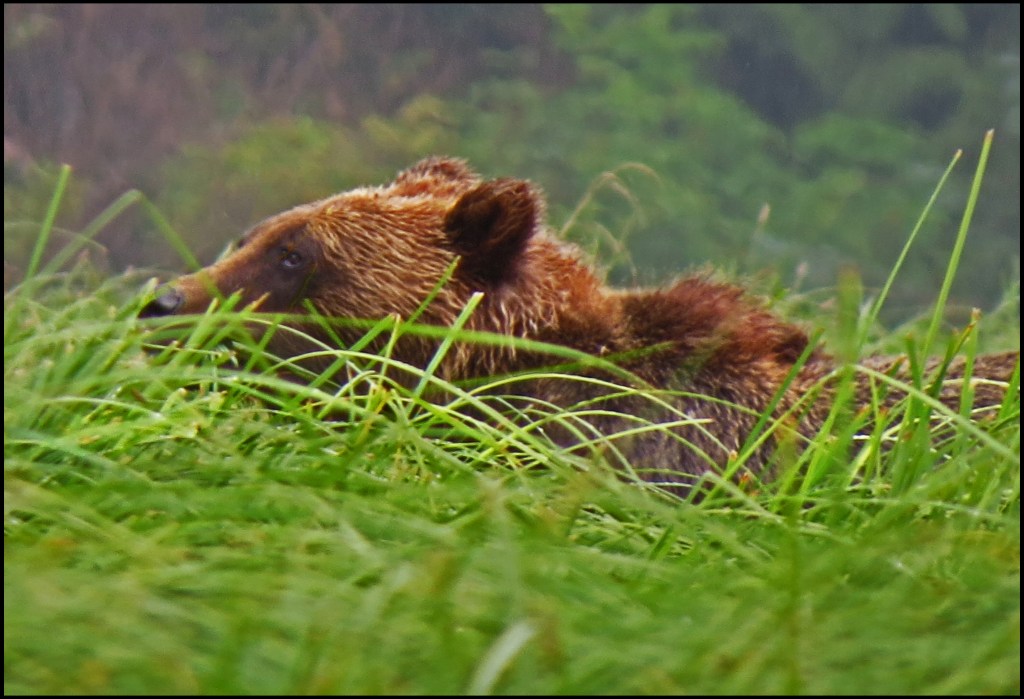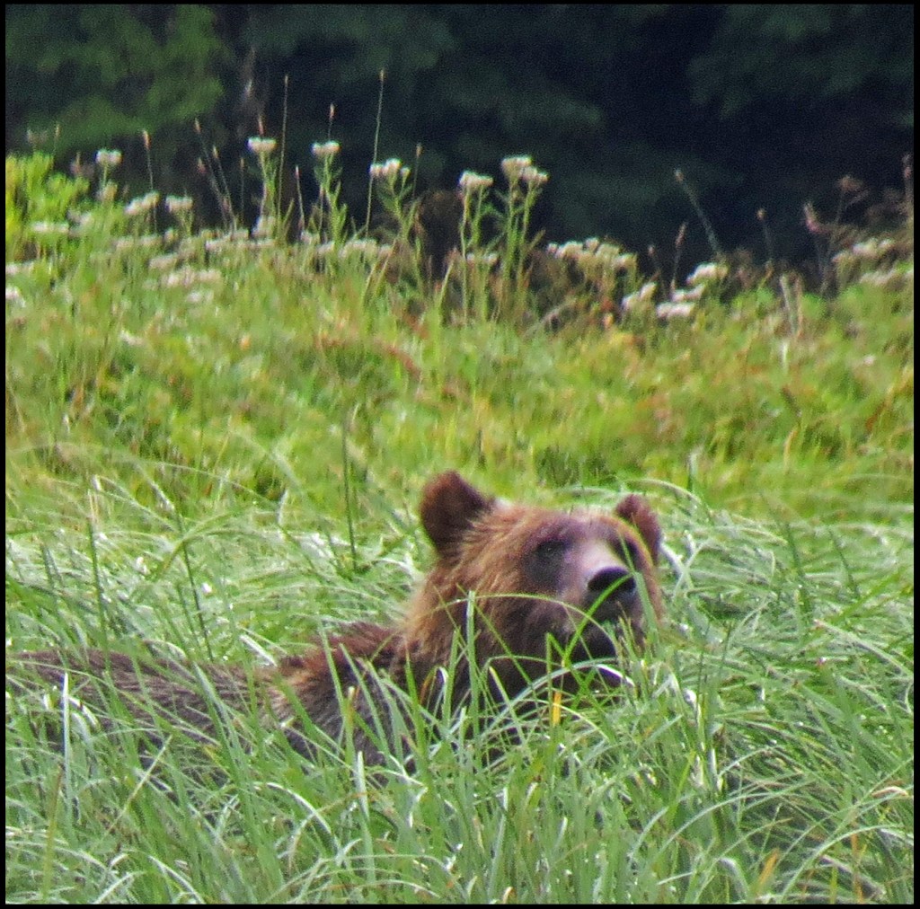 It’s really foggy this morning, and when the fog clears a bit, it’s raining.  But, I’m determined to paddle up the river, where I hope to find grizzlies.  As it turned out, I didn’t have to paddle very far before I spotted grizzly ears peeking above the tall sedge.