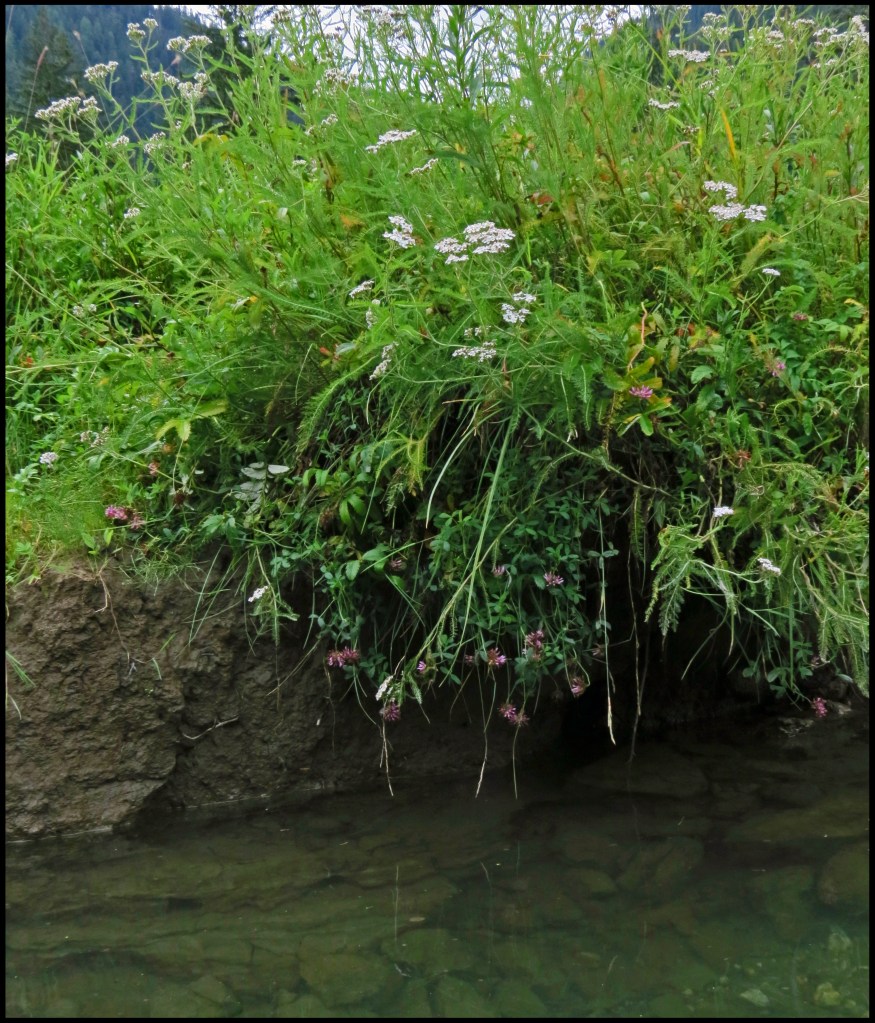 Wildflowers are in bloom along the banks of the river.