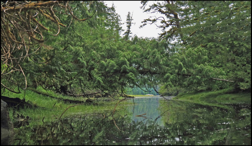 This is my last paddle in Quigley Creek, as we’re moving on to Alston Cove this morning.  I headed up the creek looking for photo ops, but didn’t get very far. Since it’s only mid-tide, I ran out of water pretty quickly.  So, I turned around and paddled out around all the little islets, waiting for the tide to get higher.  I didn’t find any critters, so I took a couple of photos of the islets and paddled a ways up Laredo Inlet.