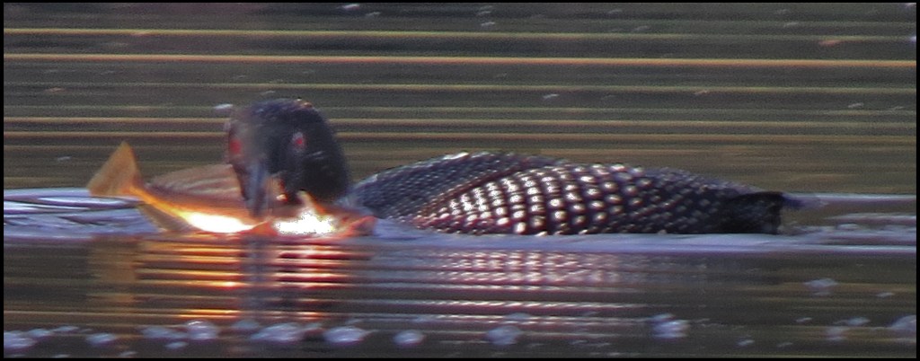 At sunset, I spotted this common loon wrestling with this fish.  Hard to believe he could swallow one this big.