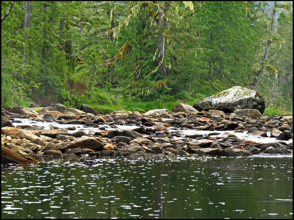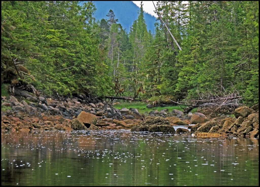 There aren’t any boats in the anchorage when we arrive at Quigley, but there are lots of salmon jumping at the mouth of the creek.  Al’s going to do some salmon fishing when we leave Quigley, headed up Laredo Inlet, so it’s nice to know the salmon have arrived.  Maybe this rain will bring more in.