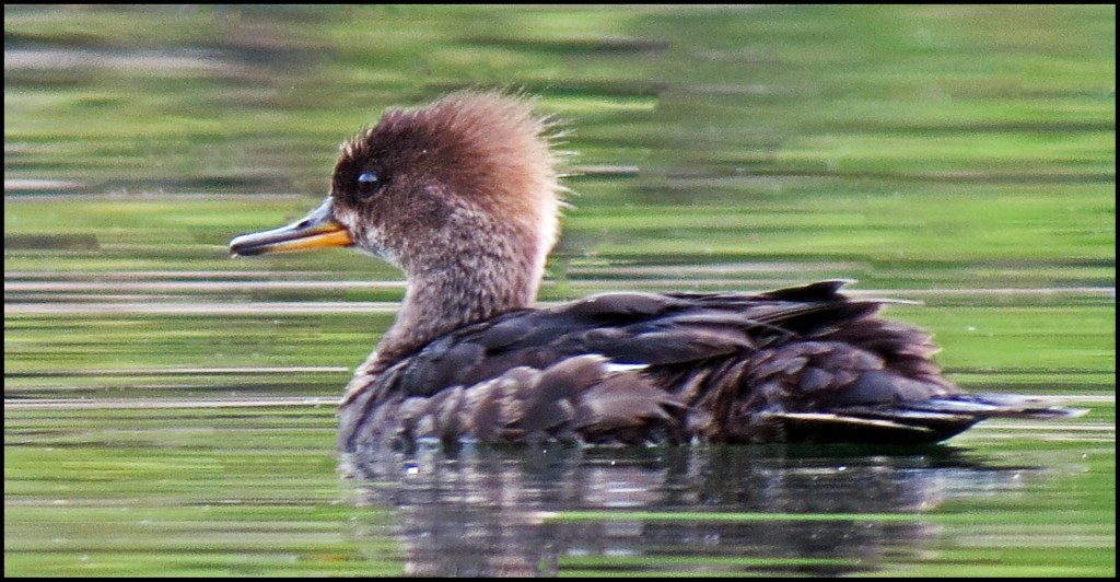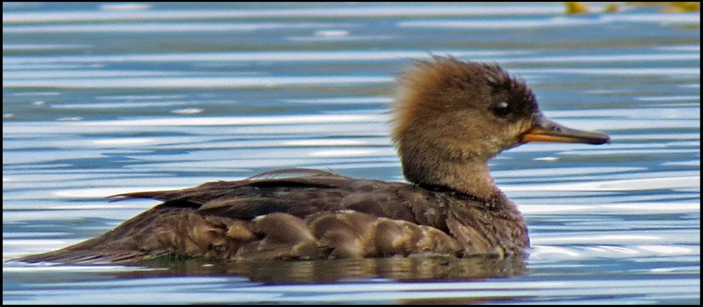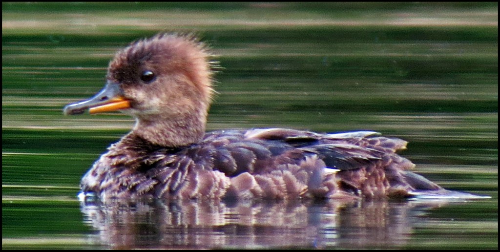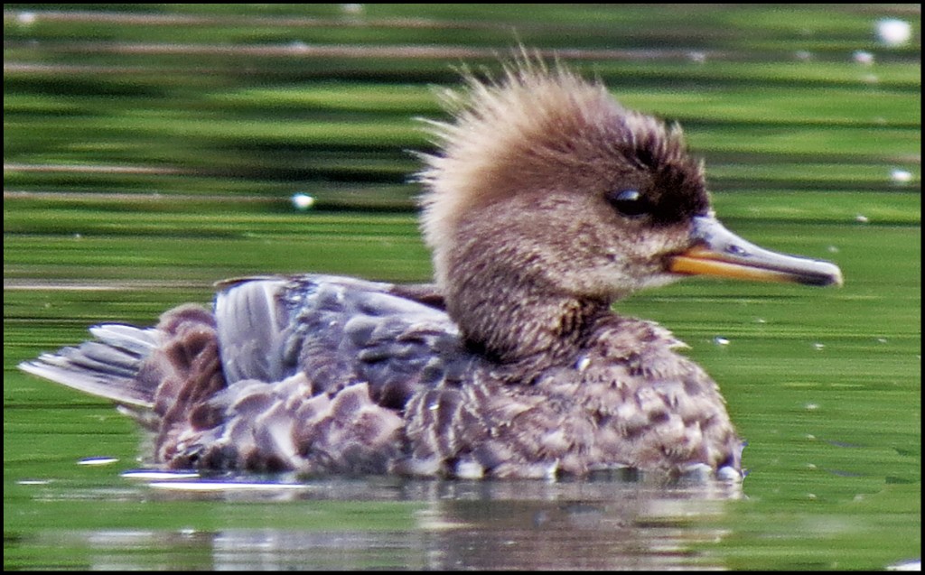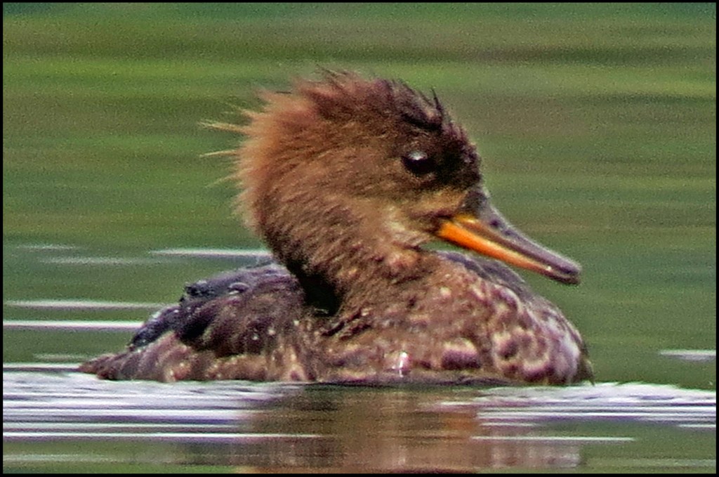 Still no blue skies, but at least it isn’t raining this morning.  At 0700 hours I set out paddling up Quigley Creek.  I didn’t get very far before I spotted a very young merganser fishing.  I thought for sure his mother must be nearby, but to my surprise, he was all alone.  I stuck with him for over an  hour, while he caught fish after fish.  His momma taught him well.