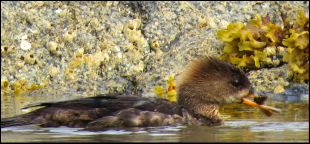 I was intent on navigating around lots of rocks because the tide was already pretty low, when I looked up and saw this family of mergansers trying to sneak passed me.  By the time I put my paddle down and got my camera out, momma had decided I looked like something threatening, and she was putting it in “R” for “Race”.