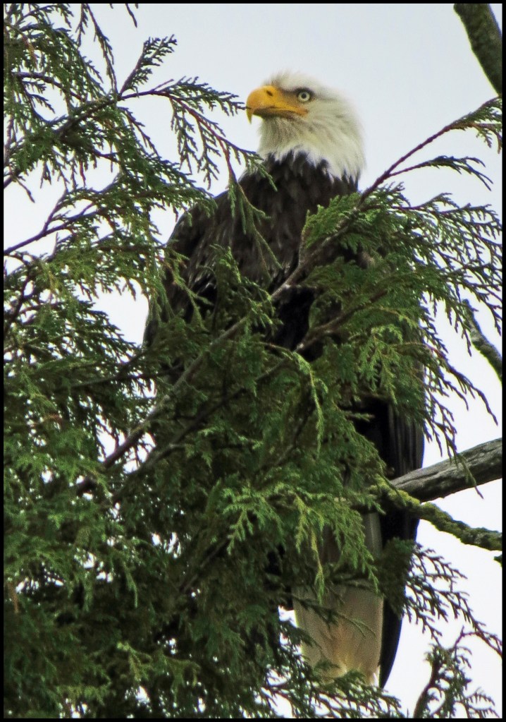 After bumping a few rocks here and there, I eventually made my way back to the anchorage.  The sea was a bit bumpy now, due to tidal conditions, but I was curious to see if the eagle I saw yesterday would be in the same spot today.  Well, he was, but I was being bounced around so much that I was only able to get this one shot.