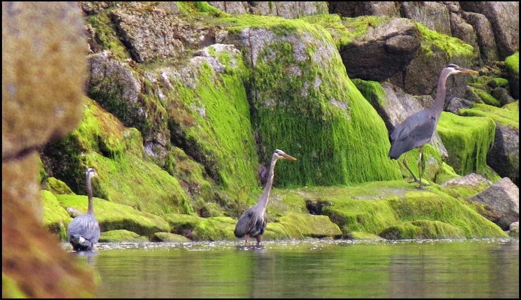When the merganser finally had his fill and flew off, I continued along the shore until I found these three herons fishing side by side.