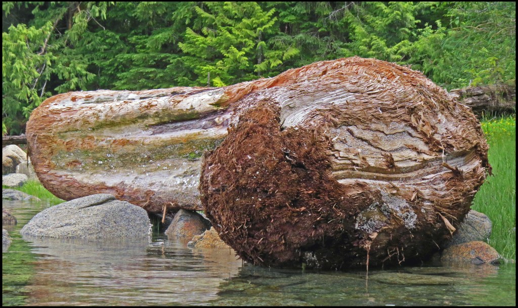 From the boat, I thought I spotted a bear on the beach.  But, when I put the binoculars on it, I discovered not a bear, but the dark brown end of a huge tree stump that had been tumbling in the sea for a very long time…. a gigantic piece of driftwood!  So that’s where I headed to get my first photo of the day.