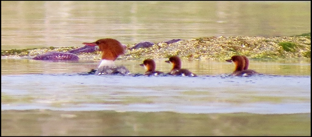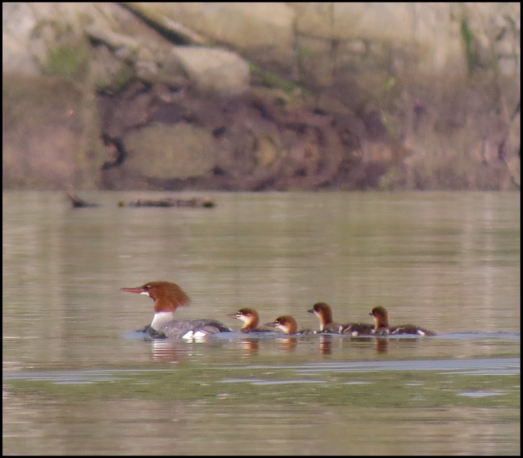 While looking for the heron, I came across a momma merganser and her babies.  As soon as momma saw me, she started paddling for the other shore with her little ones in tow.