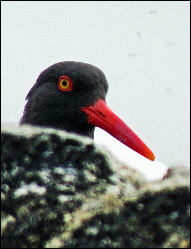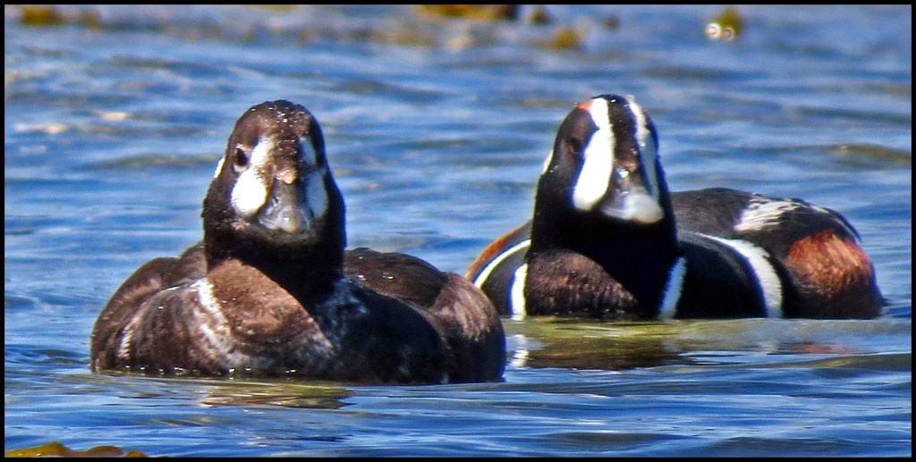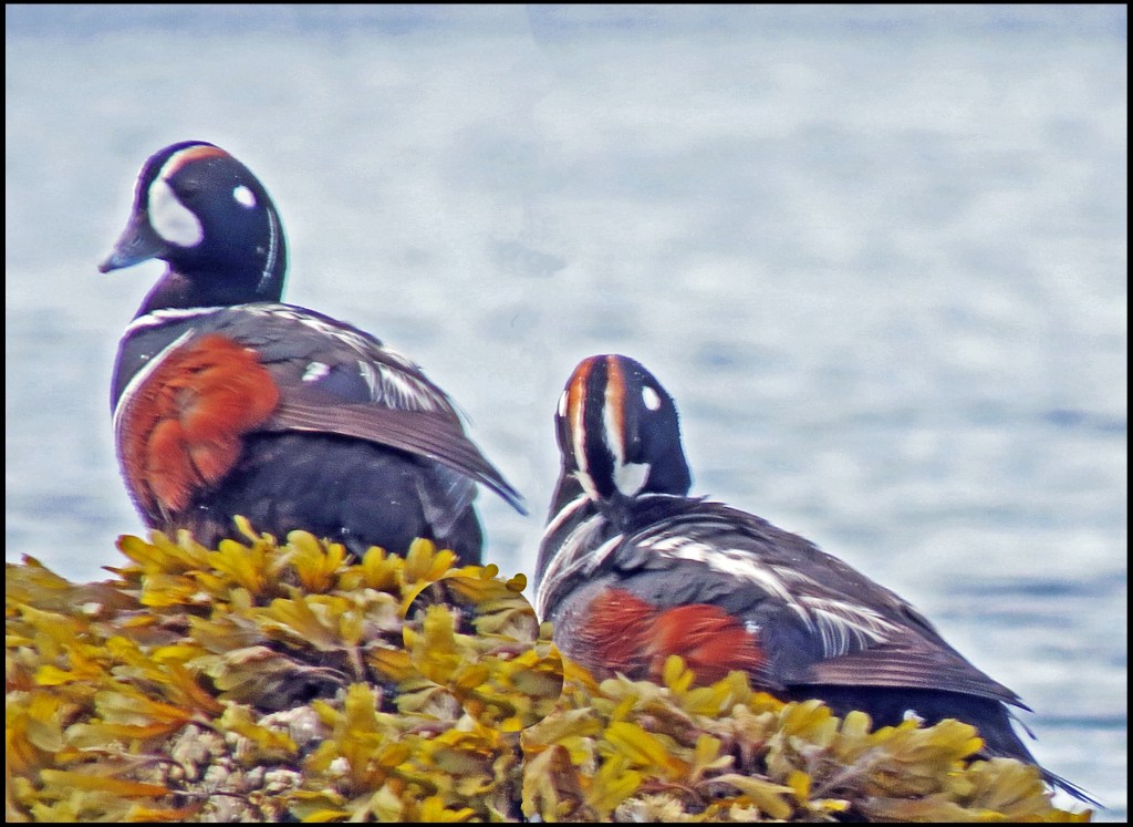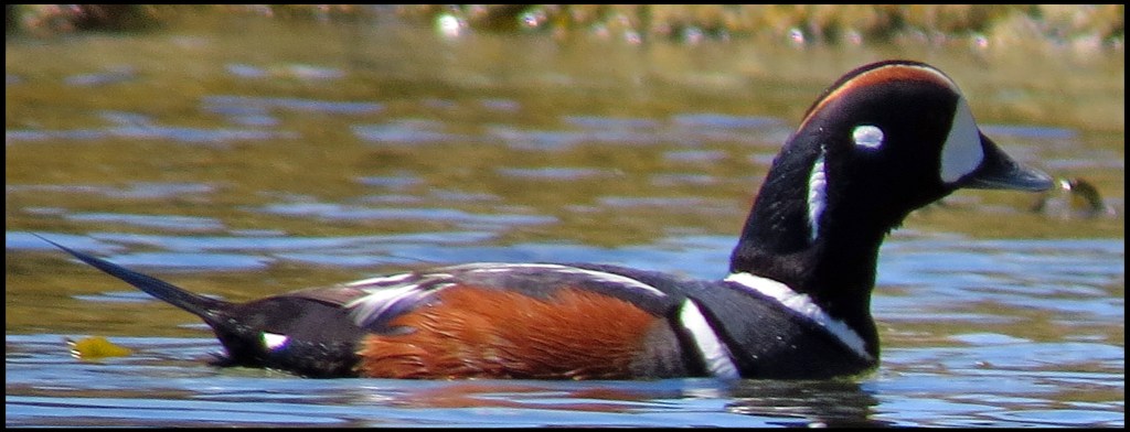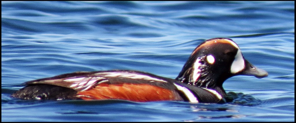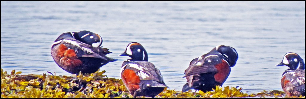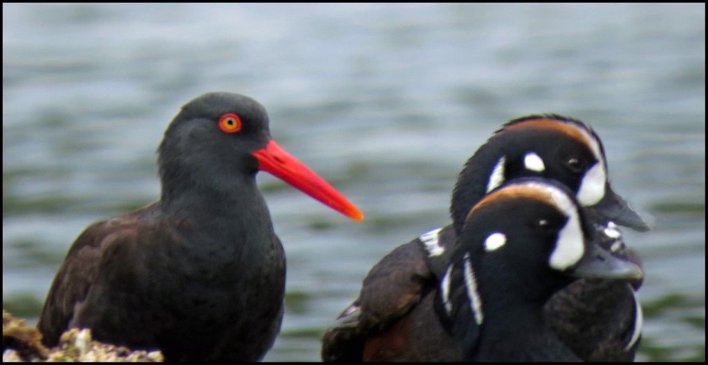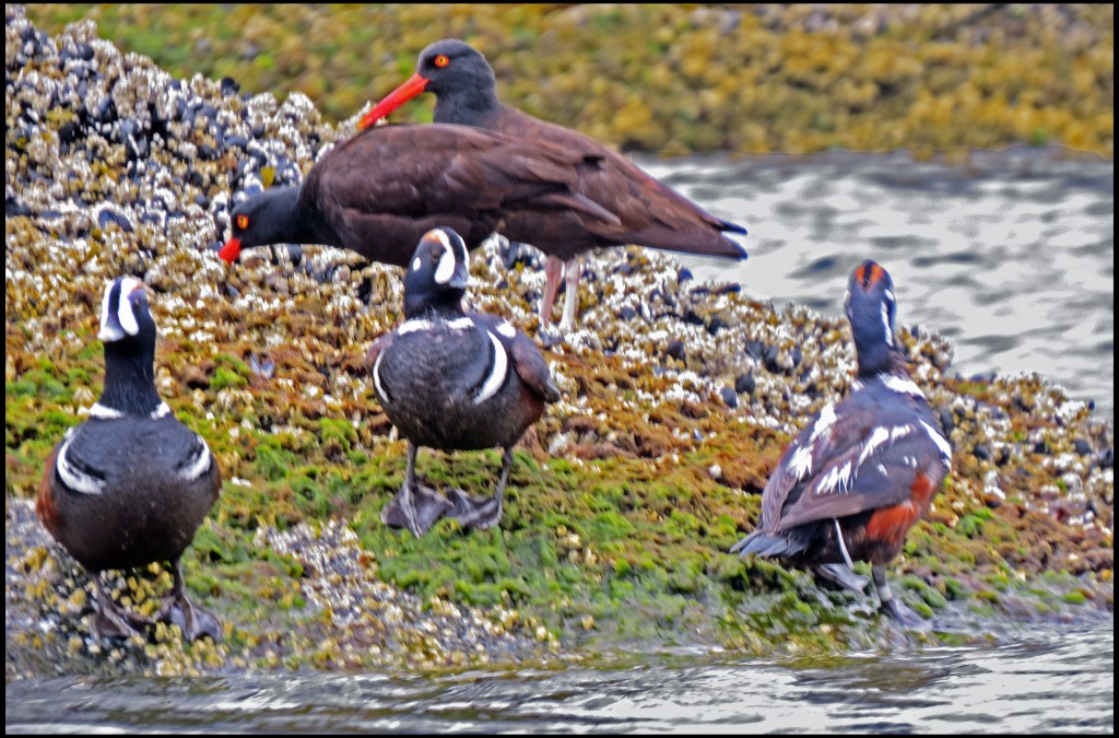 When I finally reach the rocks at the entrance, I see not one, but several oystercatchers scouring the rocks for mussels, and whatever other juicy morsels they might find.  A few harlequins are working the area also.