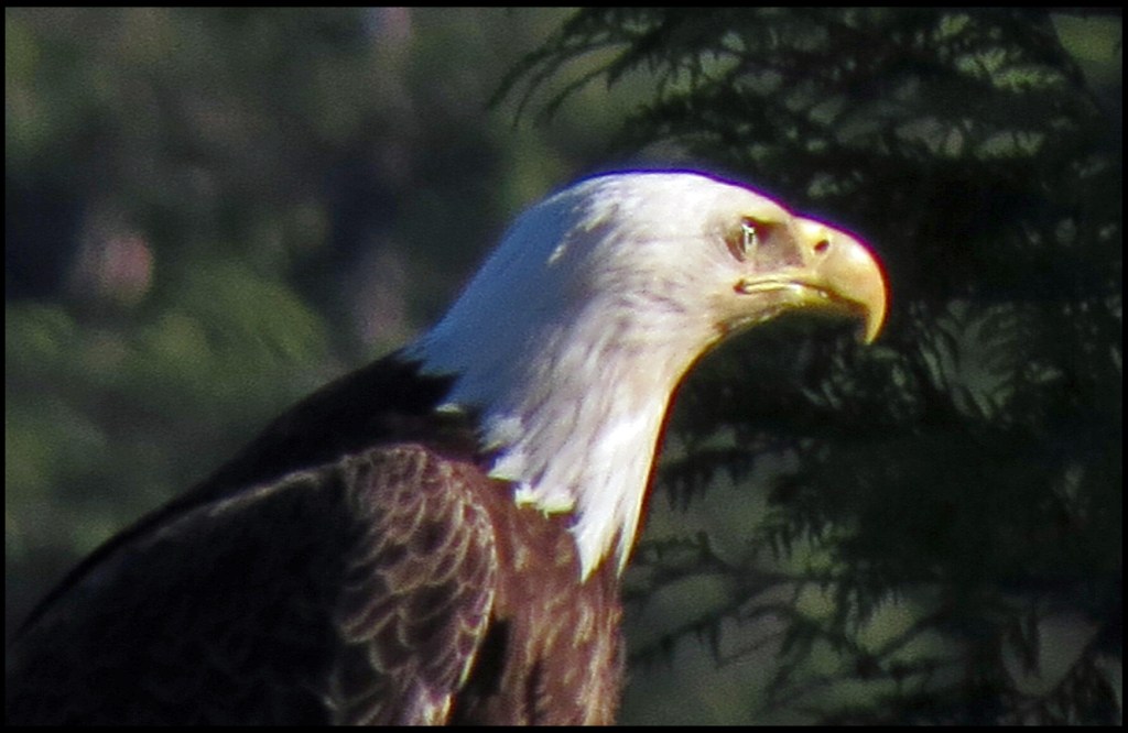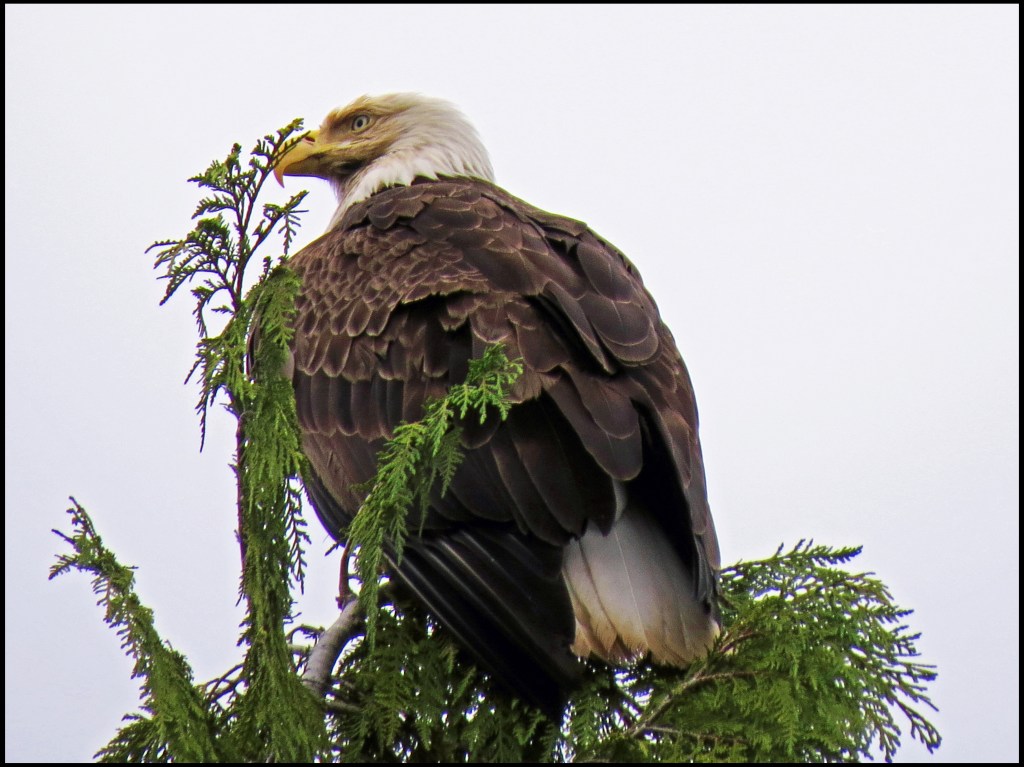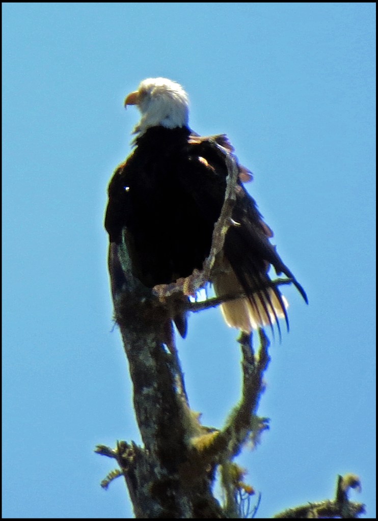 On my way back to the boat one day, I spotted this eagle.  The tree had lost its top and the eagle was nestled among the dead branches, drying his feathers.