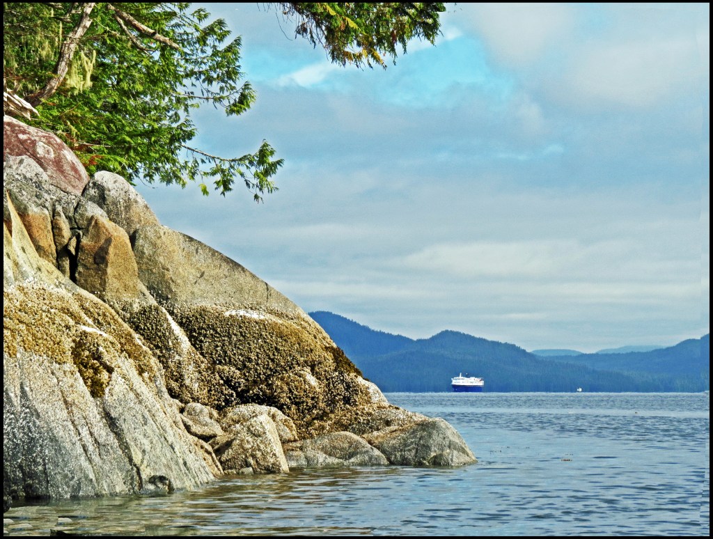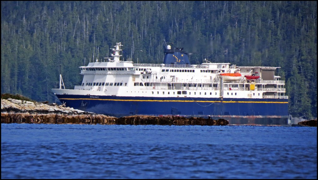 Out in Fisher Channel, I spot the ferry, “Kennicott”, headed south, passed Fog Rocks.
