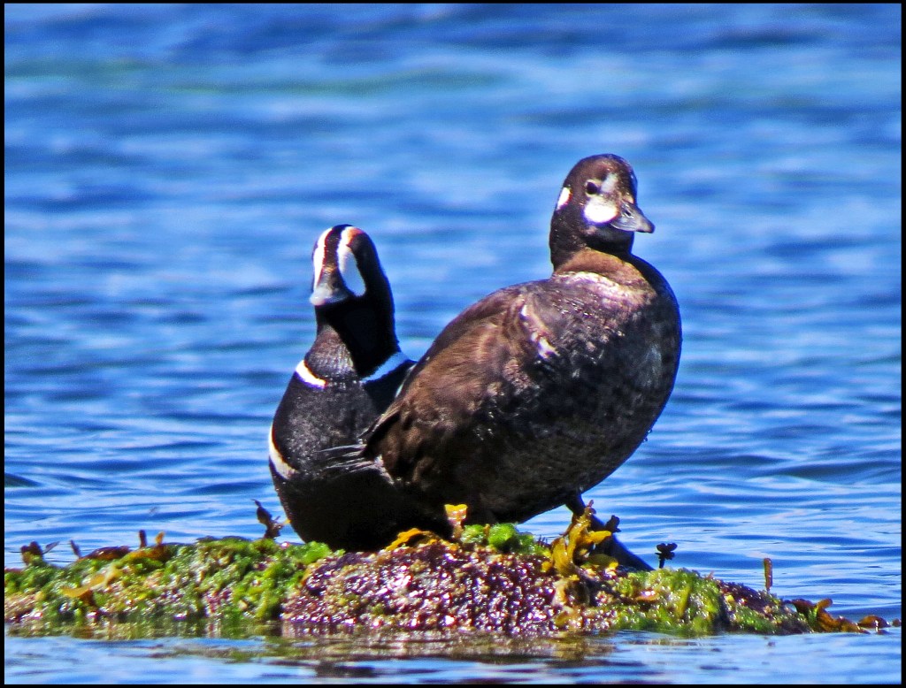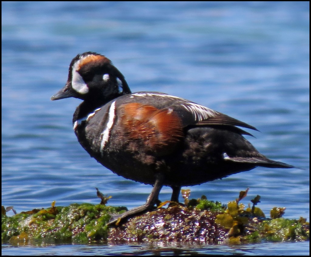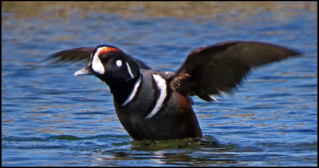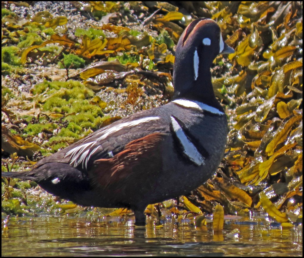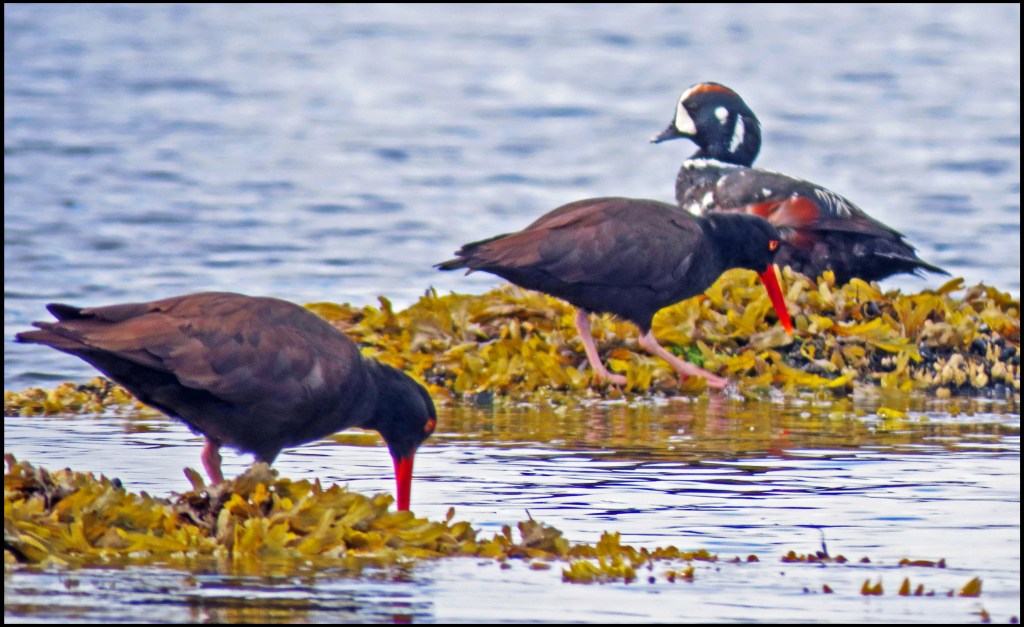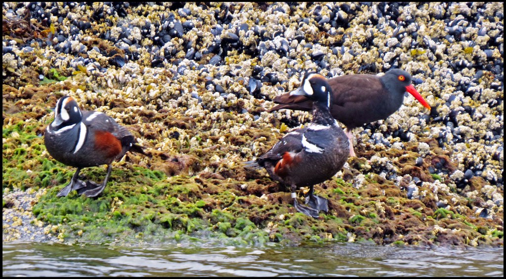 I headed for the rocks that dry at low tide.  This is where I found harlequin ducks and black oystercatchers last year.  Well, apparently it’s still one of their favorite hangouts.  The wind had come up, so I was having to paddle upwind, drift down to where I could get a shot as the wind carried me by, and then paddle back upwind to try for another shot.