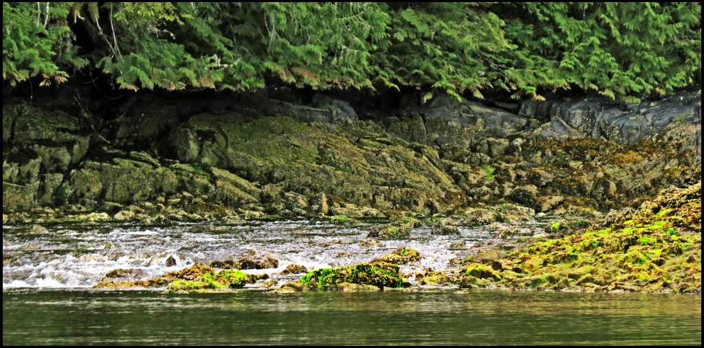 To our surprise, it isn’t foggy this morning, which is good, because we’re heading for Kisameet Bay, just 17 miles north of Kwakume Inlet.  Unfortunately, the current is against us, but the wind is blowing in the same direction as the current, so the seas aren’t bad.
