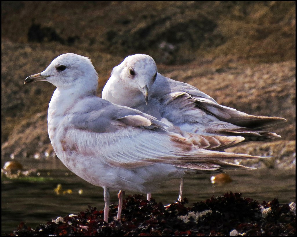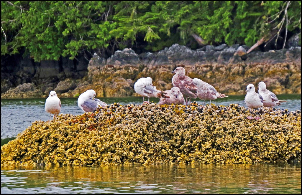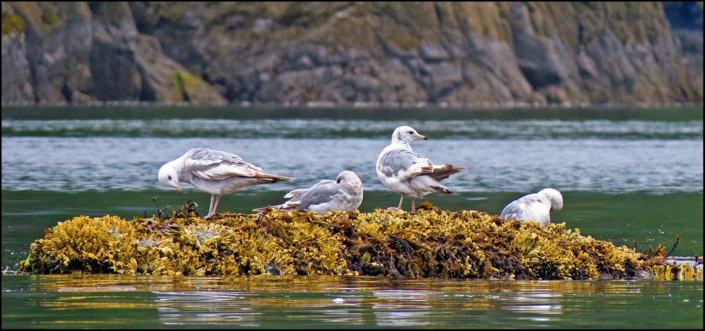 I’m up at 0600 hrs and out paddling by 0700 hrs, determined to avoid all the problems the wind caused me yesterday.  I am rewarded with flat calm seas.  Paddling is effortless, as I set out for the entrance, which is quite a distance south of the anchorage.  On my way, I check out the rock where I found the harlequins and oystercatchers yesterday.  Seagulls have taken over the rock.