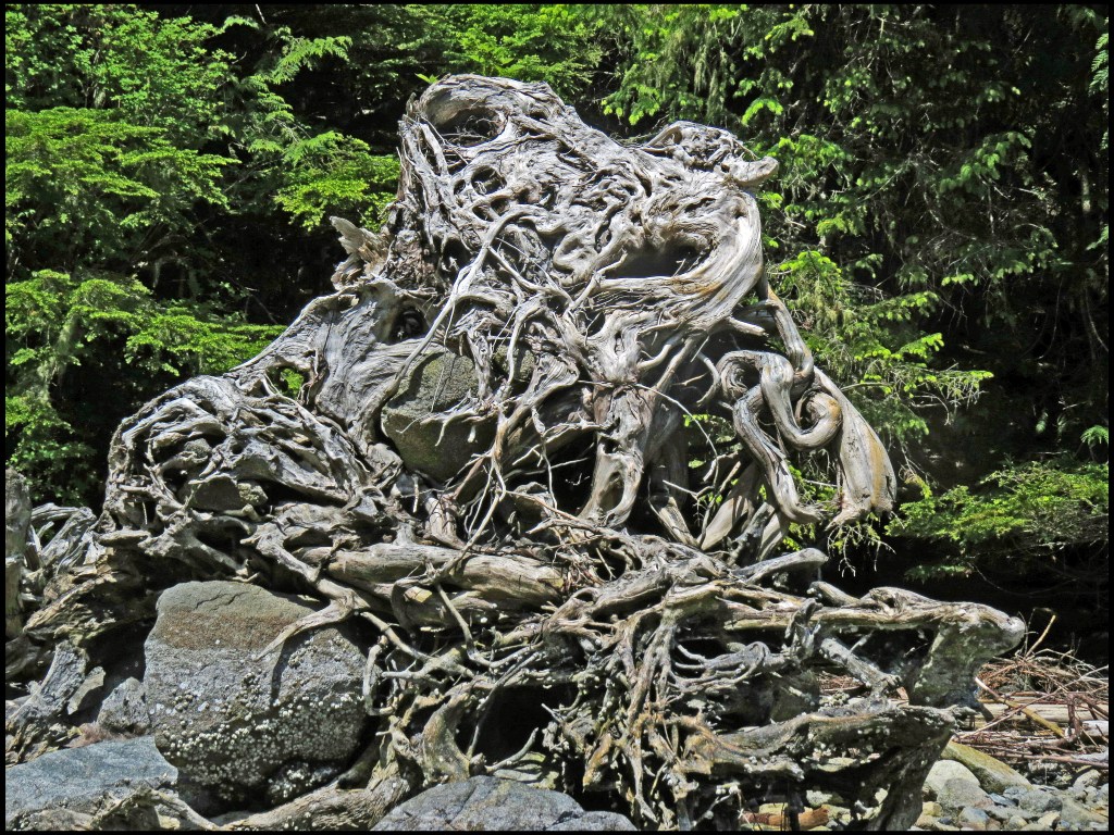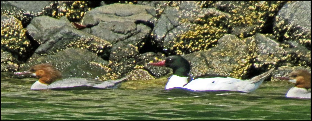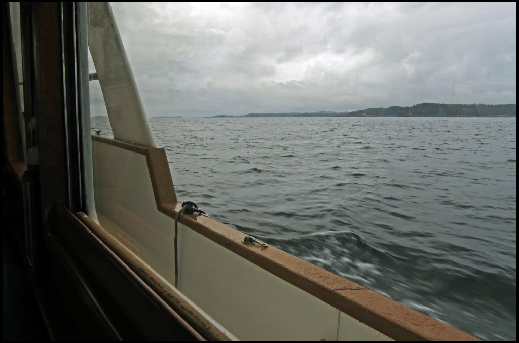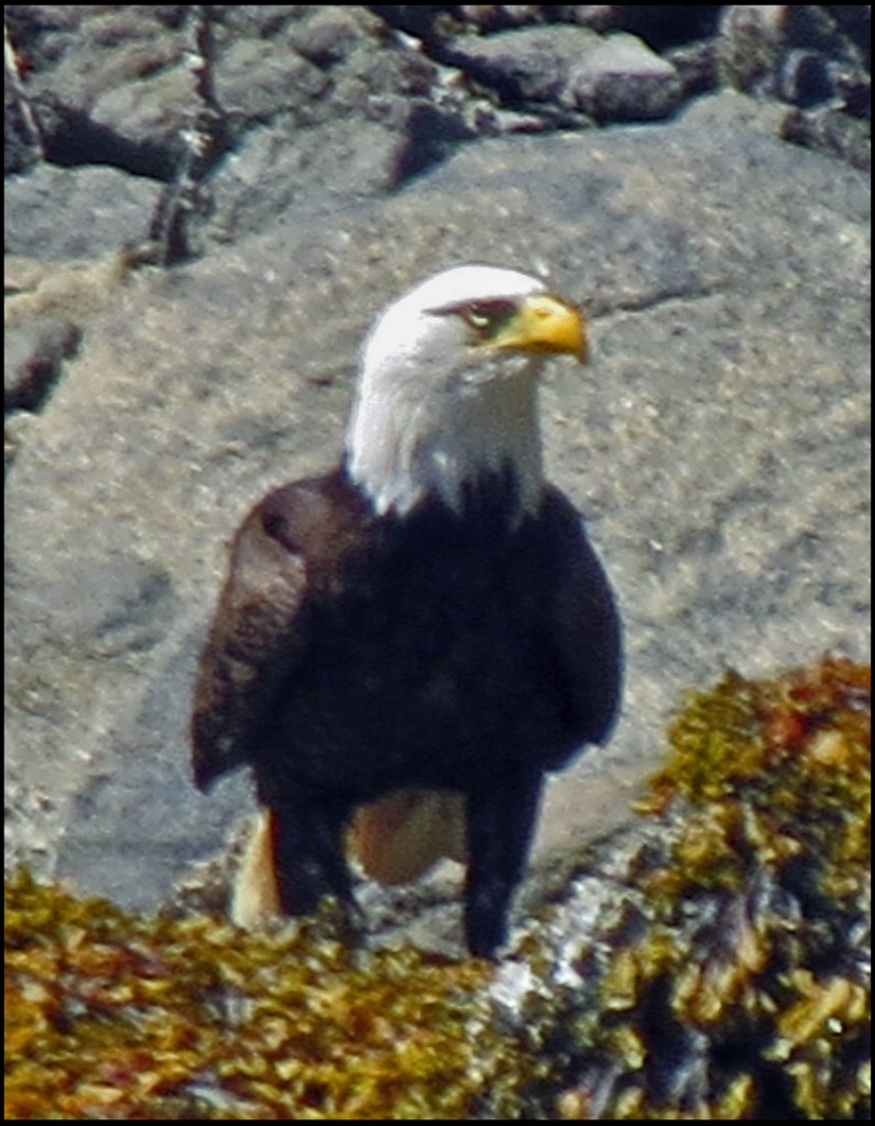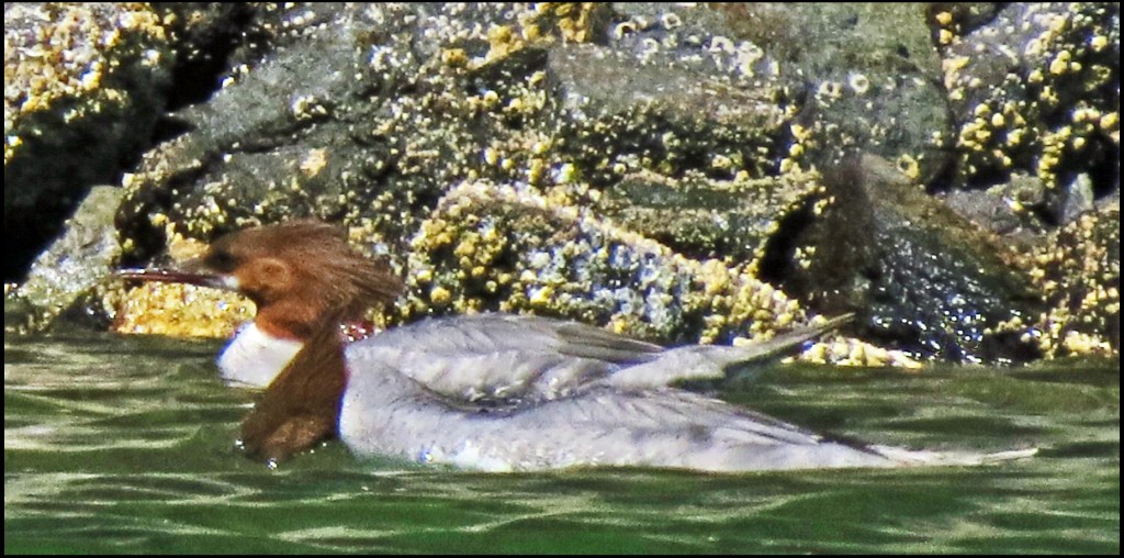 I paddled all around the shoreline of Green Island. I discovered quite a few small areas of sand and eel grass, which Dungeness crabs like. We’ll have to try crabbing here next year. And, there were many downed trees, with branches that are submerged at high water and are covered with mussels. Minks love mussels, so I checked out all the fallen trees, hoping to spot a mink. Finally, after about an hour-and-a-half of paddling, I started calling, “Here, Minky, Minky, Minky”, and I’ll be darned if a mink didn’t pop up. By the time I got my camera out and focused, he ran for cover. I waited to see if he’d come out again, and he did. This time, he sat staring. Unfortunately, the seas were so bouncy, that I couldn’t focus. He teased me, running one way and then the other, stopping long enough to check me out, but not long enough for me to focus in on him. I was so frustrated I could have screamed. Oh, well.