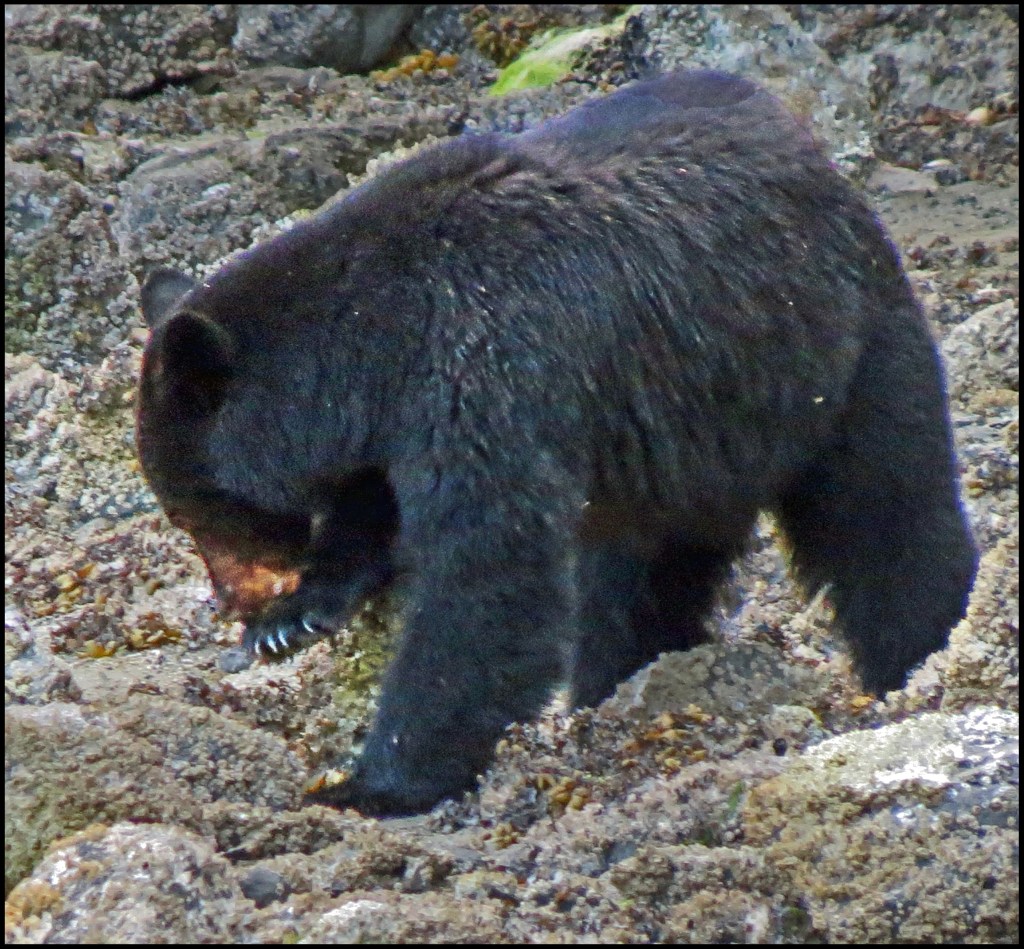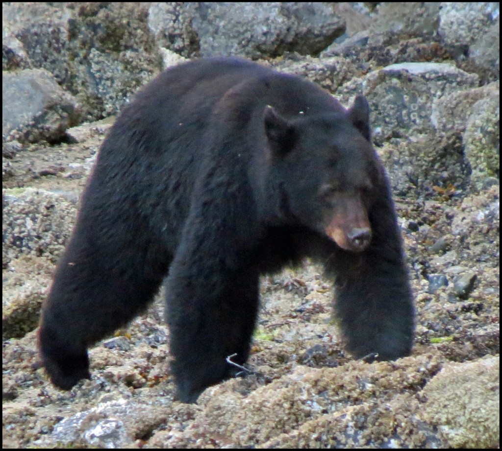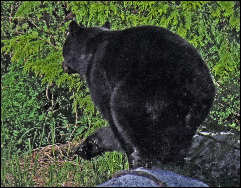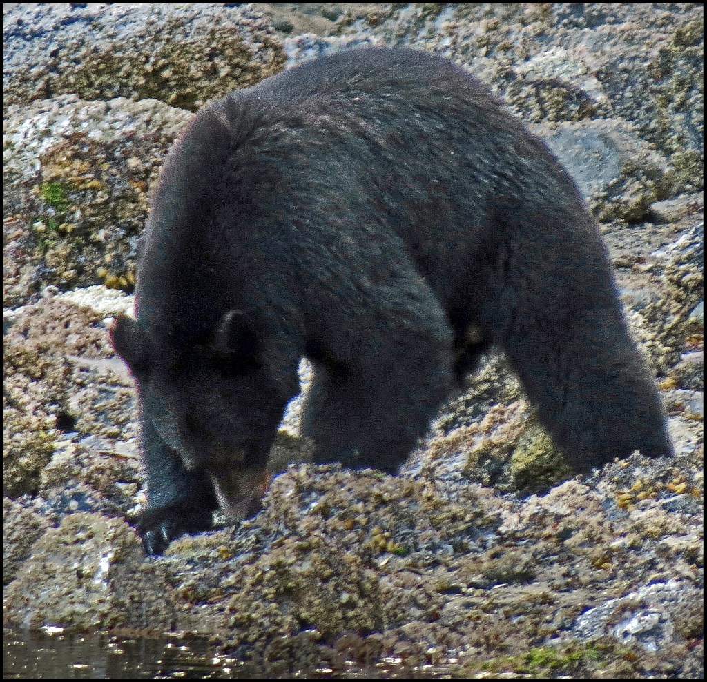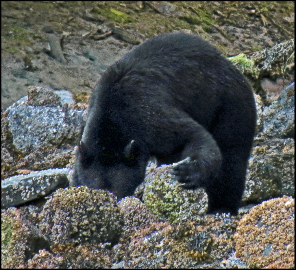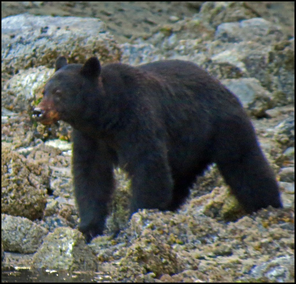 This evening, just before dark, Al spotted a bear turning rocks onshore. I grabbed my camera and tried to get some shots, even though it was almost dark.