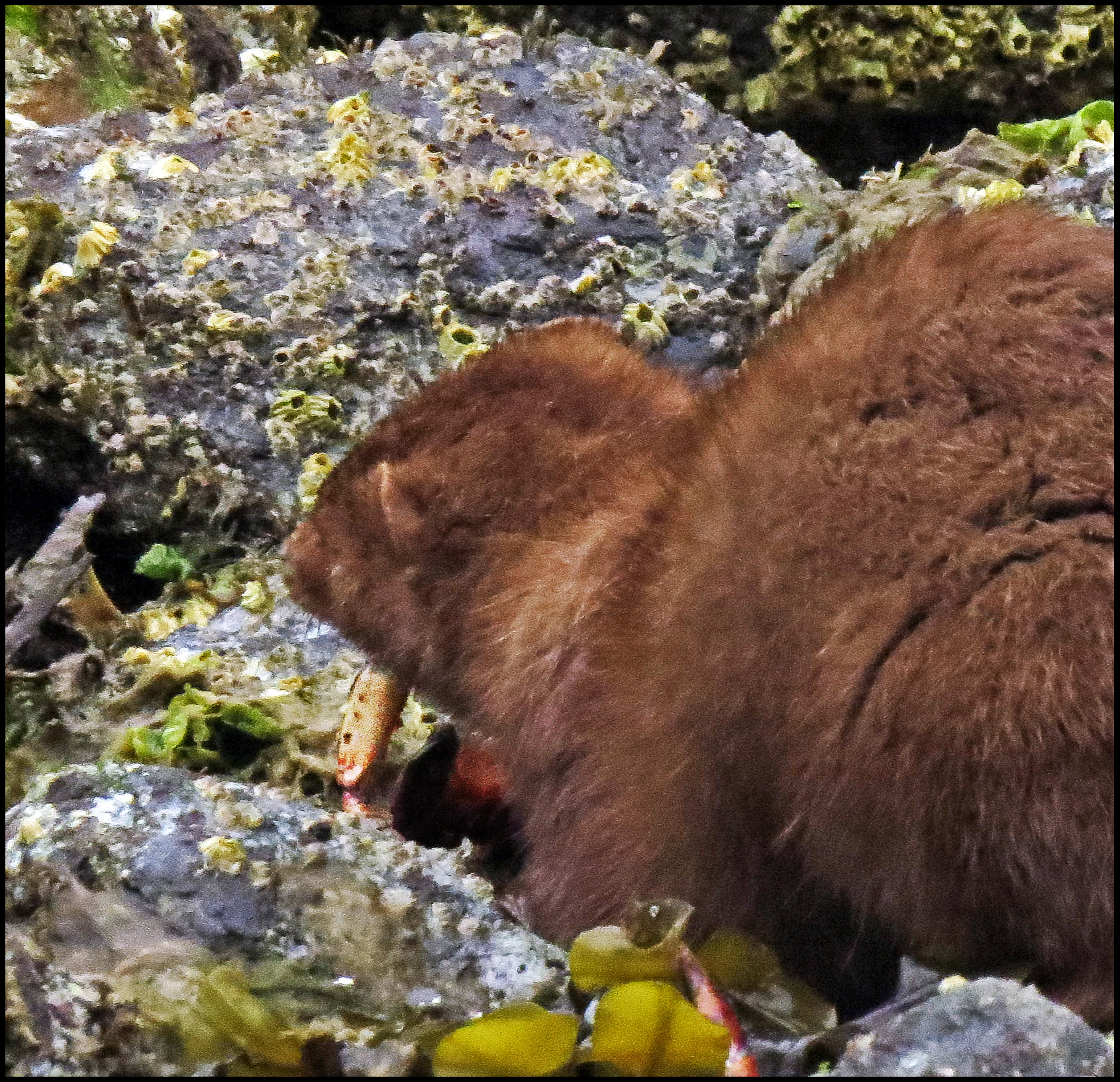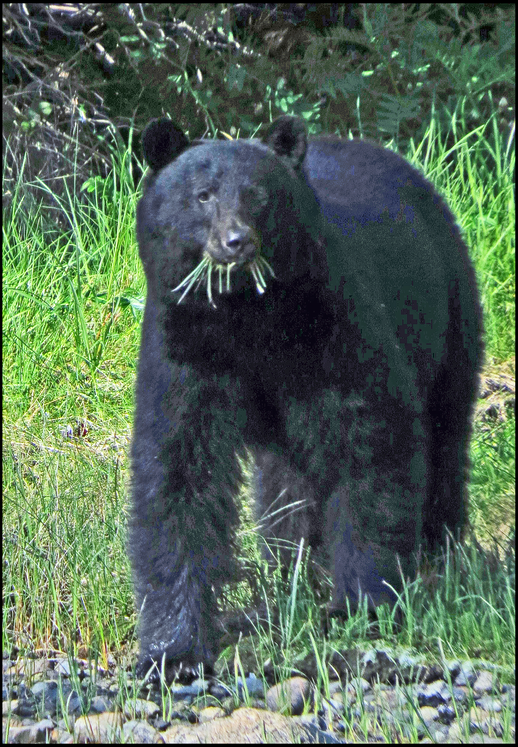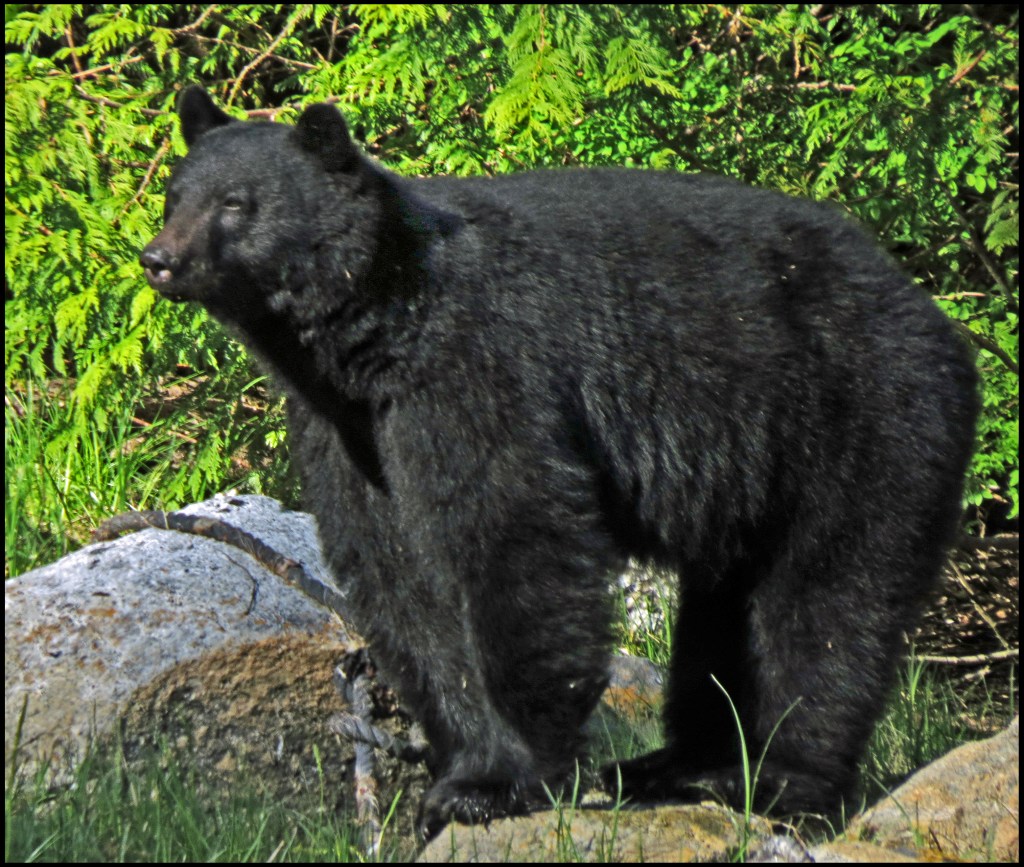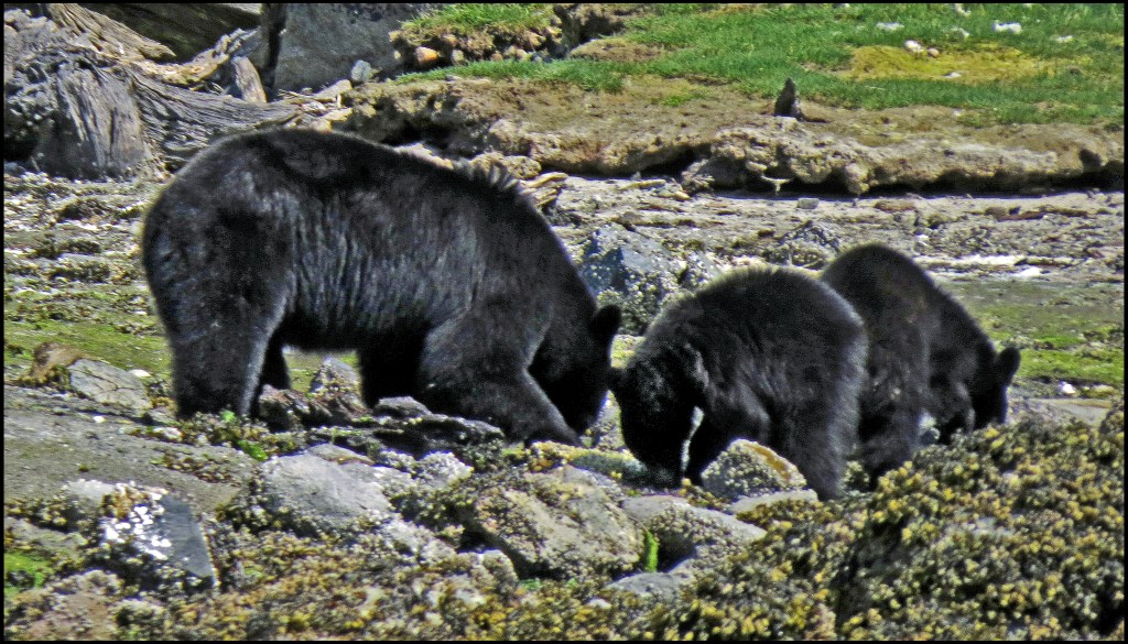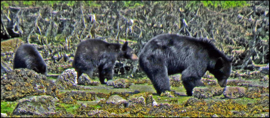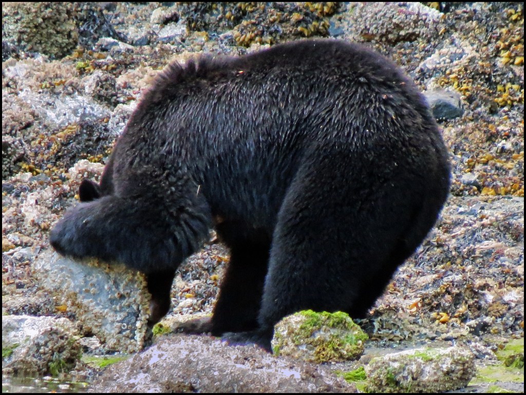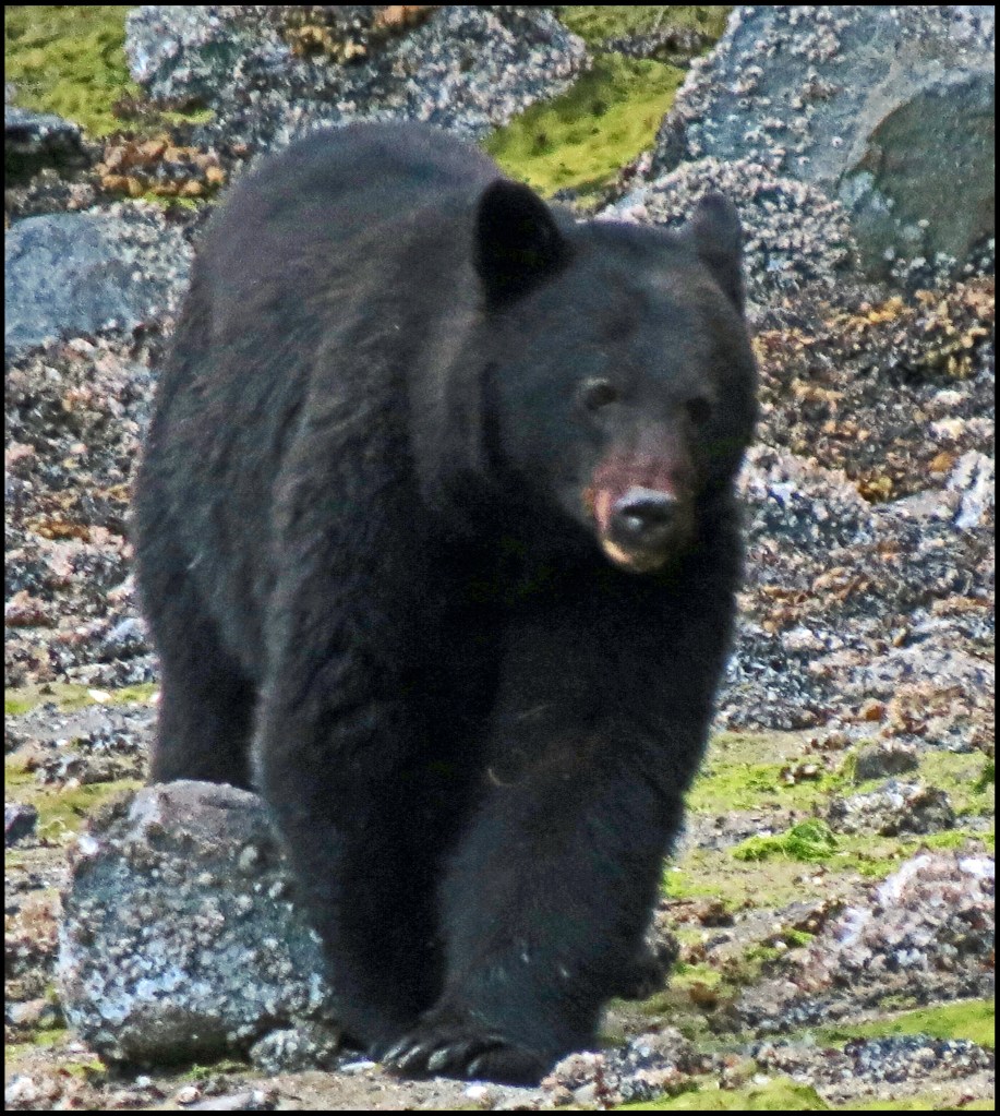 This evening, just before dark, Al spotted a bear turning rocks onshore. I grabbed my camera and tried to get some shots, even though it was almost dark.